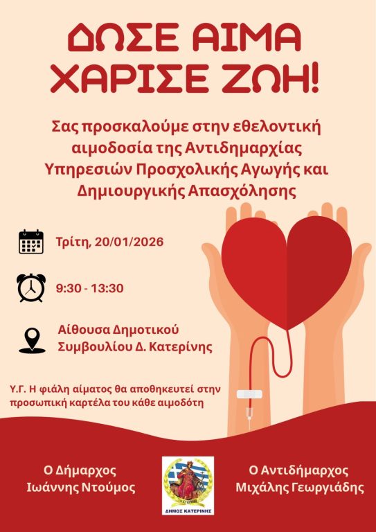 Δημος Κατερινης – Αντιδημαρχια Προσχολικης Αγωγης: Δωσε Αιμα – Χαρισε Ζωη/Εθελοντικη Αιμοδοσια – 20/01/2026