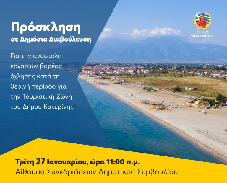 Προσκληση σε Δημοσια Διαβουλευση για την αναστολη εργασιων βαρεας οχλησης κατα τη θερινη περιοδο για την Τουριστικη Ζωνη του Δημου Κατερινης