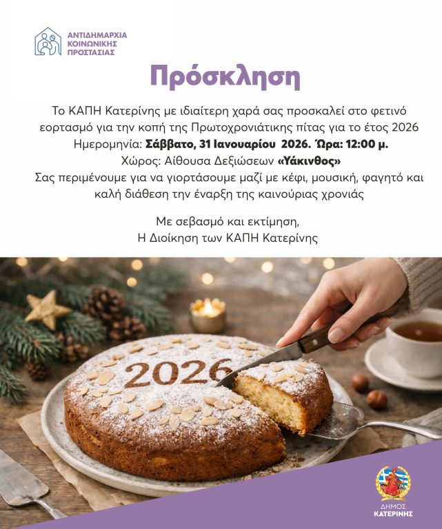 ΚΑΠΗ Δ. Κατερινης: Εκδηλωση για την κοπη της πρωτοχρονιατικης πιτας – 31 Ιανουαριου