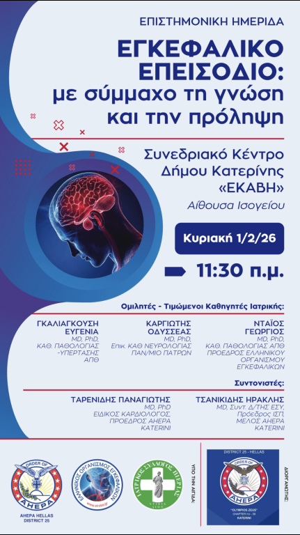 Επιστημονικη ημεριδα του τμηματος «Ολυμπιος Ζευς» ΑΧΕΠΑ ΕΛΛΑΣ – «Εγκεφαλικο επεισοδιο: Με συμμαχο τη γνωση και την προληψη»