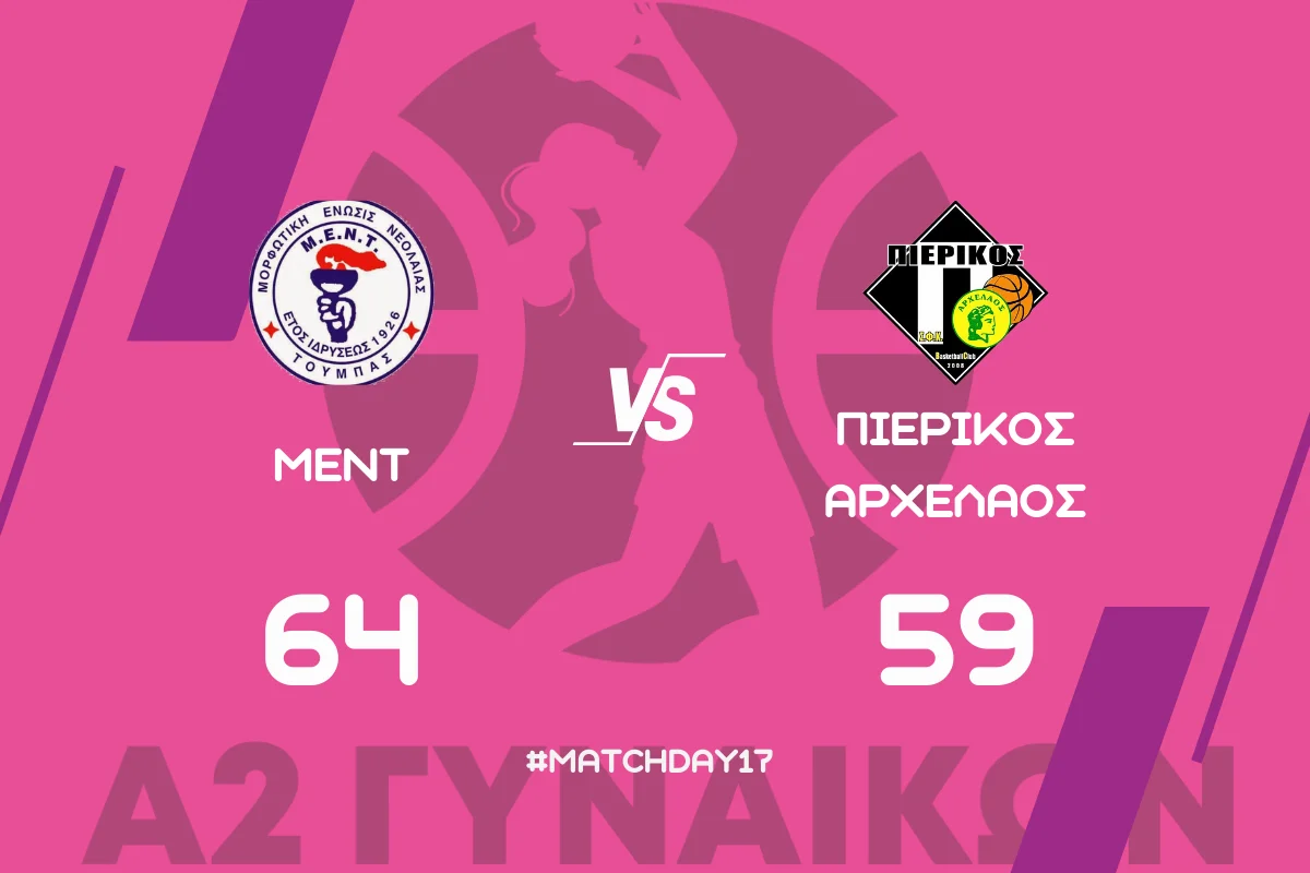 Α2 Εθνικη Κατηγορια Γυναικων (17η αγωνιστικη): ΜΕΝΤ – ΣΦΚ Πιερικος Αρχελαος 64-59