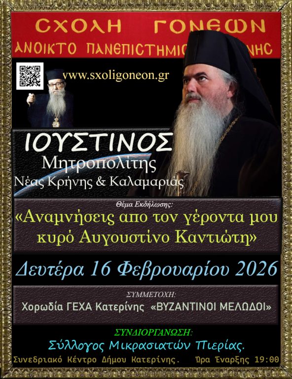 «Αναμνησεις απο τον γεροντα μου κυρο Αυγουστινο Καντιωτη» την Δευτερα 16 Φεβρουαριου 2026.