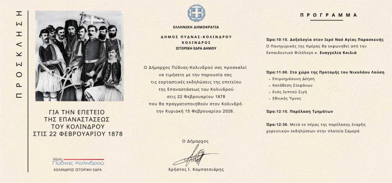 Προσκληση για τις εορταστικες εκδηλωσεις της επετειου της Επαναστασης του Κολινδρου, Κυριακη 15 Φεβρουαριου 2026