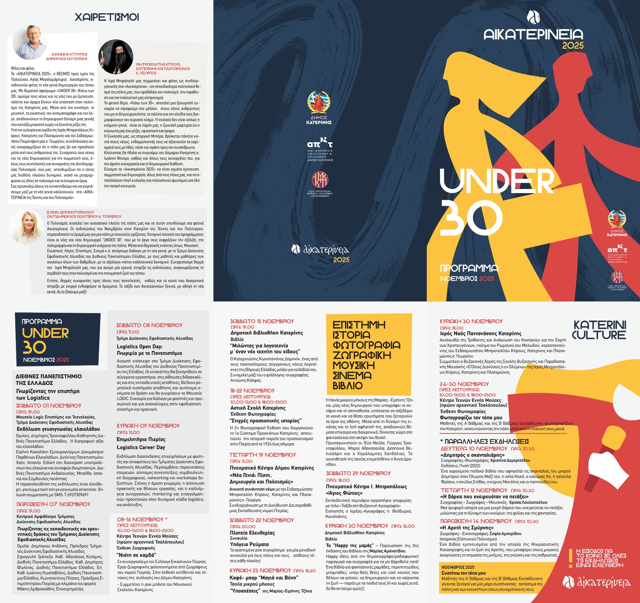 Από την πλευρά της, η αντιδήμαρχος Πολιτισμού – Τουρισμού, Ελίνα Διαμαντοπούλου σημείωσε: «Οι εκδηλώσεις του Νοεμβρίου στην Κατερίνη της Τέχνης και του Πολιτισμού, σηματοδοτούν το όραμά μας για μια πόλη με ανοιχτούς ορίζοντες. Κεντρικό στοιχείο του προγράμματος είναι οι νέες και νέοι δημιουργοί "UNDER 30", που με το έργο τους εκφράζουν την εξέλιξη, την πολυμορφία και τη δημιουργική ενέργεια της πόλης […] ανοίγουμε διάλογο με τη νέα γενιά: με το Τμήμα Διοίκησης Εφοδιαστικής Αλυσίδας του Διεθνούς Πανεπιστημίου Ελλάδος, με τους μαθητές και μαθήτριες των σχολείων όλων των βαθμίδων, με το αξιόλογο ντόπιο καλλιτεχνικό δυναμικό […]. Το ταξίδι των Αικατερινείων ξεκινά, με οδηγό τη νέα γενιά. Ας το ζήσουμε μαζί!».