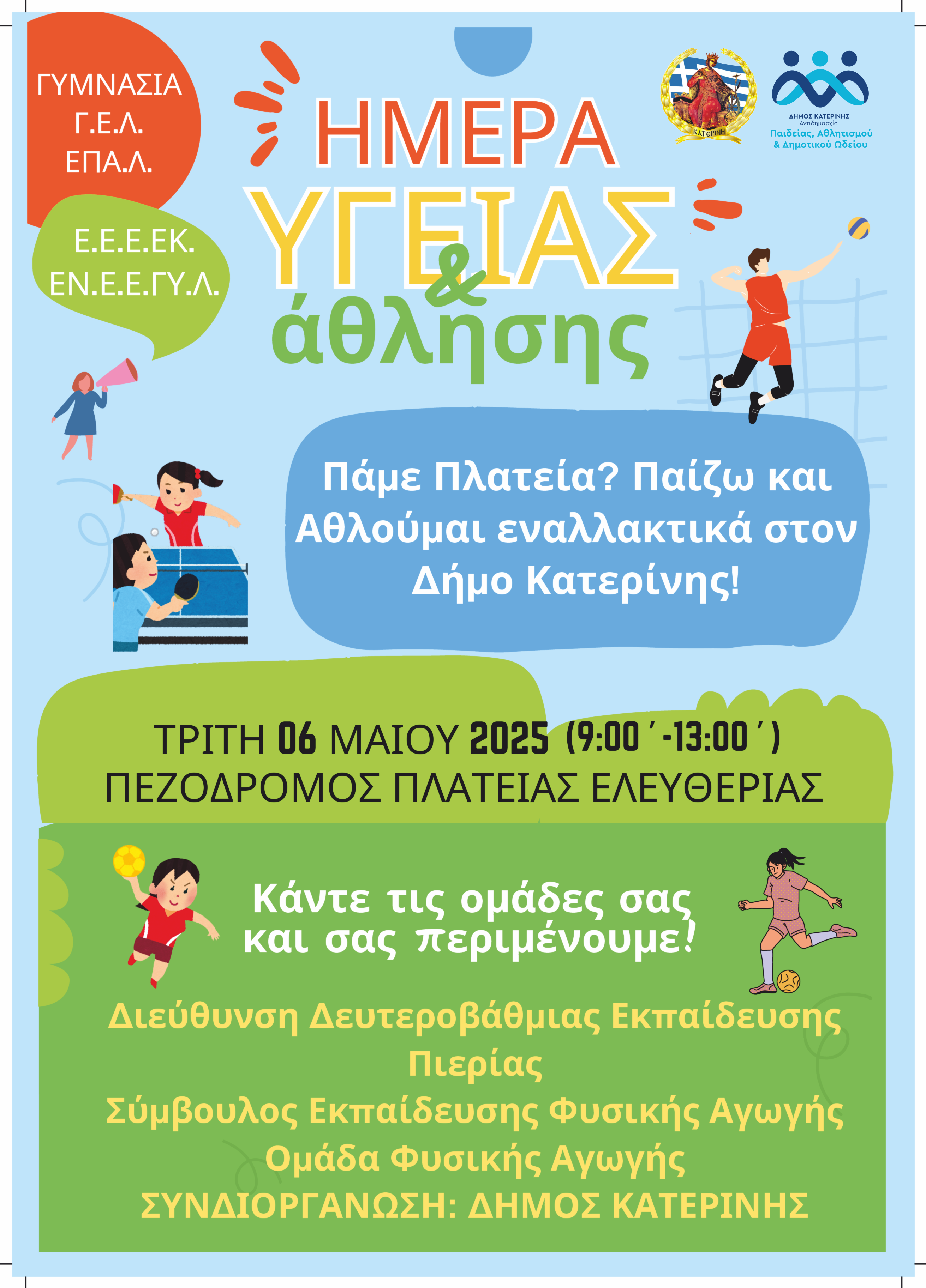 Με στόχο την ενίσχυση της φυσικής δραστηριότητας στους εφήβους και την καταπολέμηση της παιδικής και εφηβικής παχυσαρκίας, για δεύτερη συνεχόμενη χρονιά διοργανώνεται στον Δήμο Κατερίνης η Ημερίδα Δράσεων Φυσικής Δραστηριοποίησης και Εναλλακτικών Μορφών Άθλησης. Η διοργάνωση είναι αποτέλεσμα της συνεργασίας της Διεύθυνσης Δευτεροβάθμιας Εκπαίδευσης Πιερίας, της Συμβούλου Εκπαίδευσης Φυσικής Αγωγής και του Τμήματος Φυσικής Αγωγής με τον Δήμο Κατερίνης και την Αντιδημαρχία Παιδείας, Αθλητισμού & Δημοτικού Ωδείου.