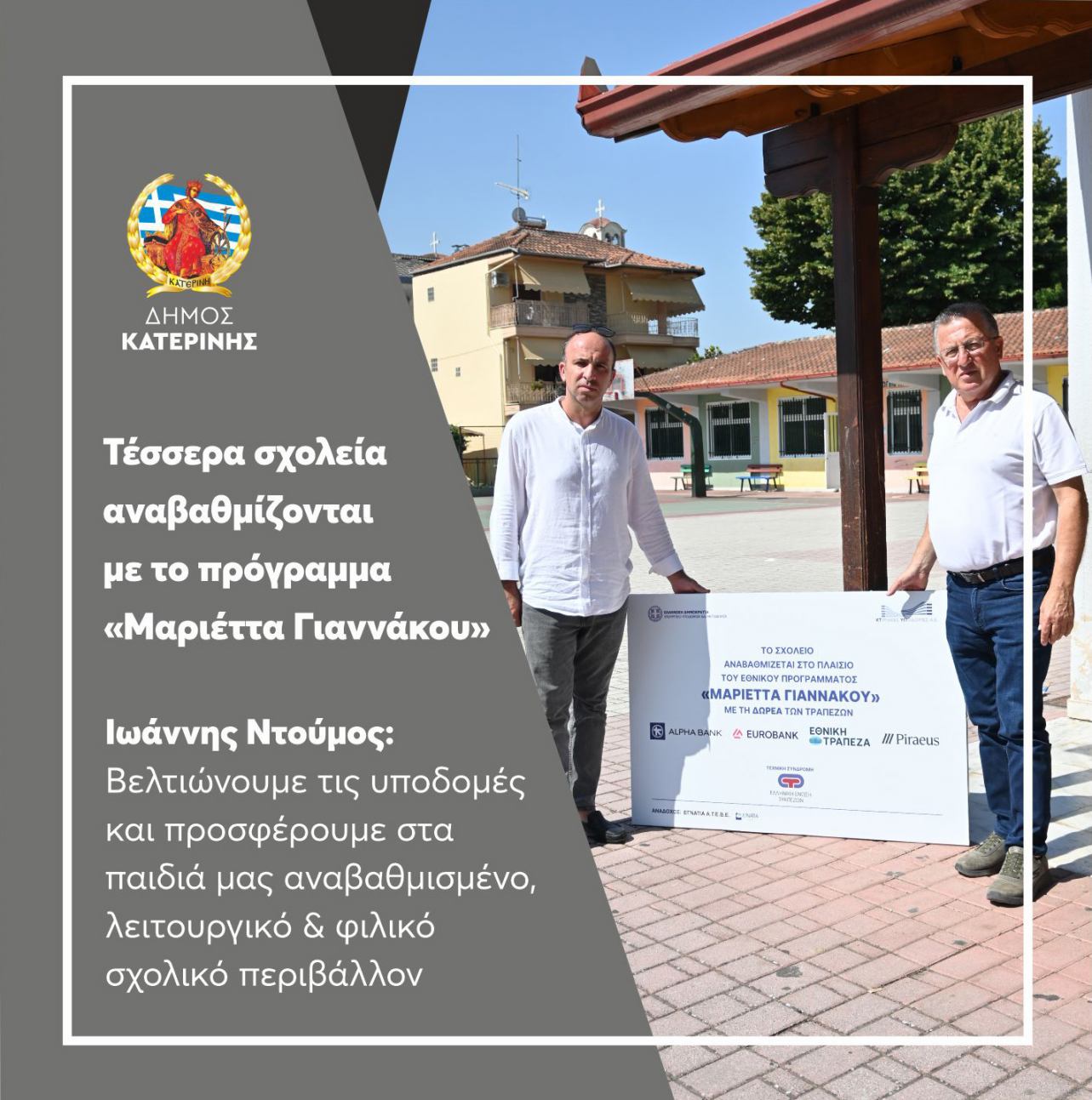 Σε εξέλιξη παρεμβάσεις από τον Δήμο Κατερίνης σε τέσσερα σχολεία στο πλαίσιο του  προγράμματος Ανακαίνισης Σχολικών Κτιρίων «Μαριέττα Γιαννάκου», το οποίο υλοποιείται από το Υπουργείο Υποδομών και Μεταφορών, σε συνεργασία με τα Υπουργεία Παιδείας, Εσωτερικών, Εθνικής Οικονομίας και τις «Κτιριακές Υποδομές Α.Ε.», με χρηματοδότηση από τη δωρεά της Ελληνικής Ένωσης Τραπεζών.