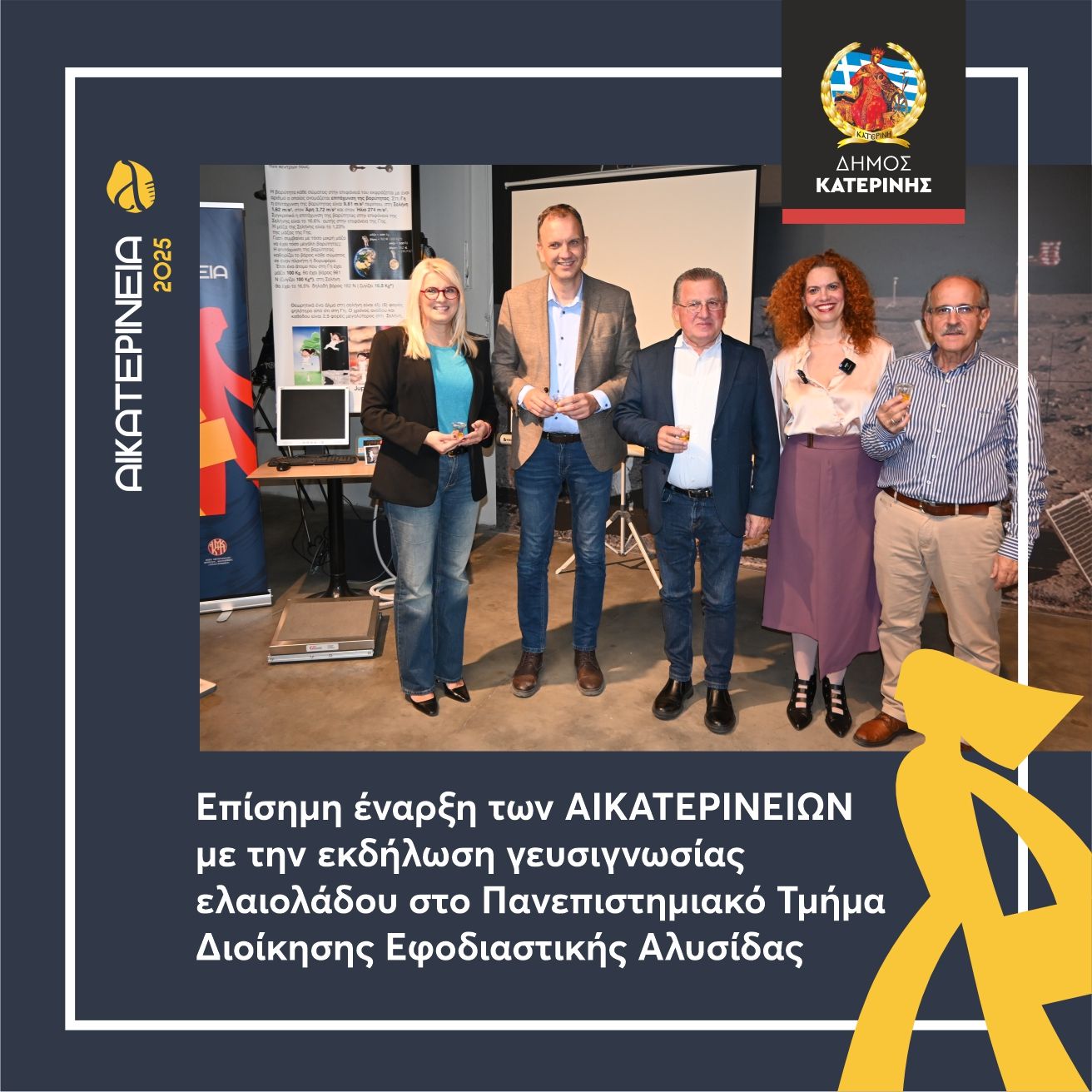 Στο Μουσείο Logic Επιστήμης και Τεχνολογίας του Τμήματος Διοίκησης Εφοδιαστικής Αλυσίδας του Διεθνούς Πανεπιστημίου Ελλάδος (ΔΙΠΑΕ) στην Κατερίνη, μέσα από μια «εκδήλωση γευσιγνωσίας ελαιολάδου», πραγματοποιήθηκε το βράδυ του Σαββάτου, η πρώτη εκδήλωση των φετινών Αικατερινείων. Στο πλαίσιο του ετήσιου θεσμού της πόλης, ο Δήμος Κατερίνης και η Αντιδημαρχία Πολιτισμού, για πρώτη φορά, καινοτομούν δημιουργικά εγκαινιάζοντας μια νέου είδους συνεργασία με το ΔΙΠΑΕ και εντάσσοντας στο πολιτιστικό πρόγραμμα εκδηλώσεις επιστήμης.