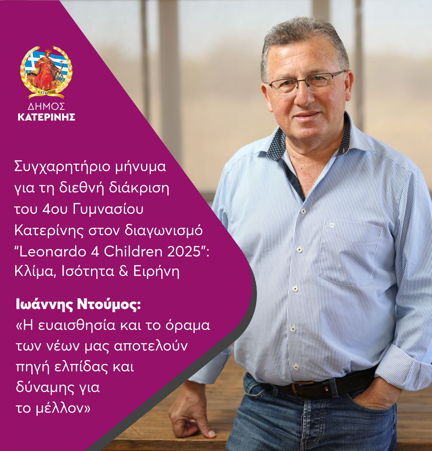 Συγχαρητήριο μήνυμα του Δημάρχου Κατερίνης για τη διεθνή διάκριση του 4ου Γυμνασίου στον διαγωνισμό “Leonardo 4 Children 2025”