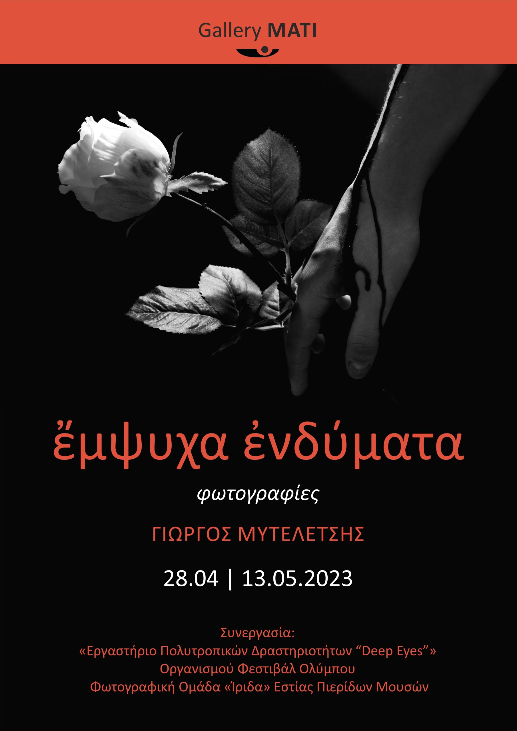 Η Gallery | Βιβλιοπωλείο «Μάτι» παρουσιάζει τη φωτογραφική έκθεση «Έμψυχα ενδύματα» του Γιώργου Μυτελέτση από 28 Απριλίου μέχρι 13 Μαΐου 2023. Στην έκθεση παρουσιάζονται φωτογραφίες νεαρών κοριτσιών του «Εργαστηρίου Πολυτροπικών Δραστηριοτήτων “Deep Eyes”» του Οργανισμού Φεστιβάλ Ολύμπου που φορούν θεατρικά κοστούμια από τις ιματιοθήκες του Κ.Θ.Β.Ε. και του θεάτρου «Πήγασος» της Κατερίνης και ενδύματα από την οικογενειακή τους γκαρνταρόμπα. Η διαδικασία της φωτογράφησης σε διάφορους τόπους της Πιερίας (Δίον, Όλυμπο, Αρχοντικό Τσαλόπουλου κ.ά.) είχε τον χαρακτήρα της «φωτογραφικής performance». Τα νεαρά κορίτσια έδωσαν νέα ψυχή στα, φορτισμένα με θεατρικές και οικογενειακές μνήμες, ενδύματα. Αυτή την ιδιαίτερη εικαστική και θεατρική ατμόσφαιρα αποδίδουν με λιτή συνθετική ματιά οι φωτογραφίες του Γιώργου Μυτελέτση.