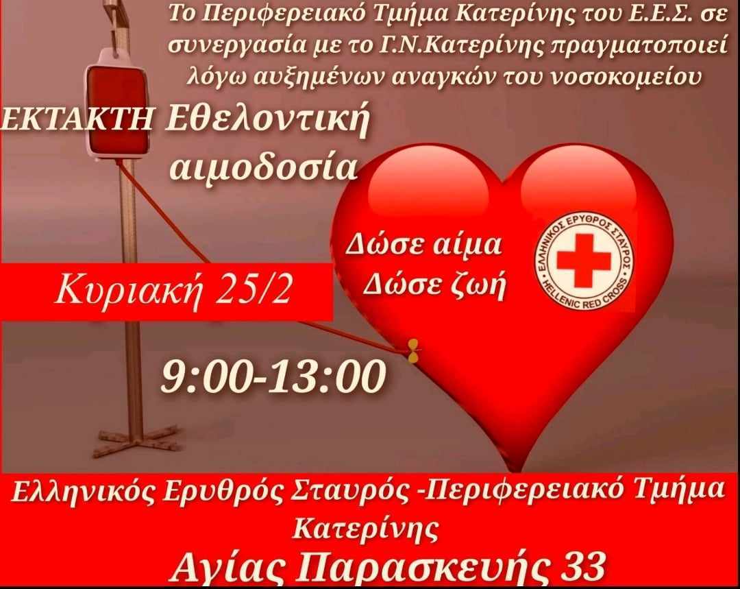 Έκτακτη εθελοντική αιμοδοσία του Ε.Ε.Σ. Κατερίνης – Κυριακή 25/2