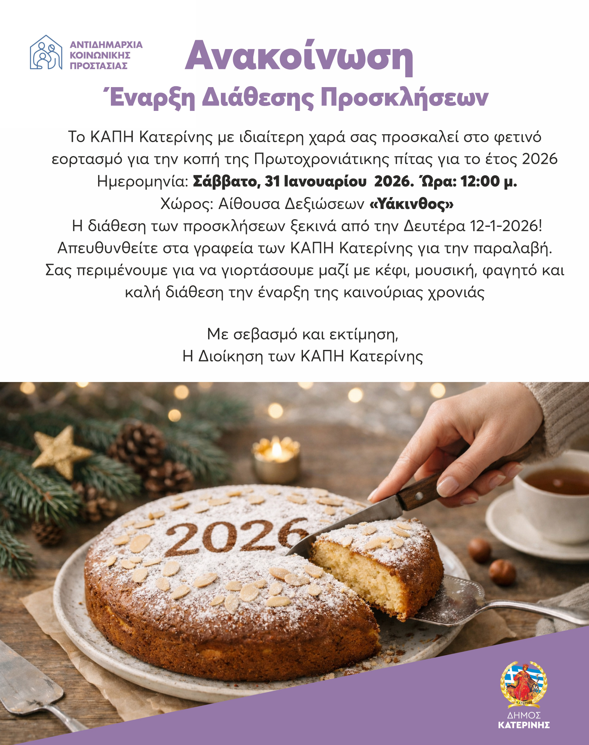 ΚΑΠΗ Δ. Κατερινης: Εκδηλωση για την κοπη της πρωτοχρονιατικης πιτας – 31 Ιανουαριου