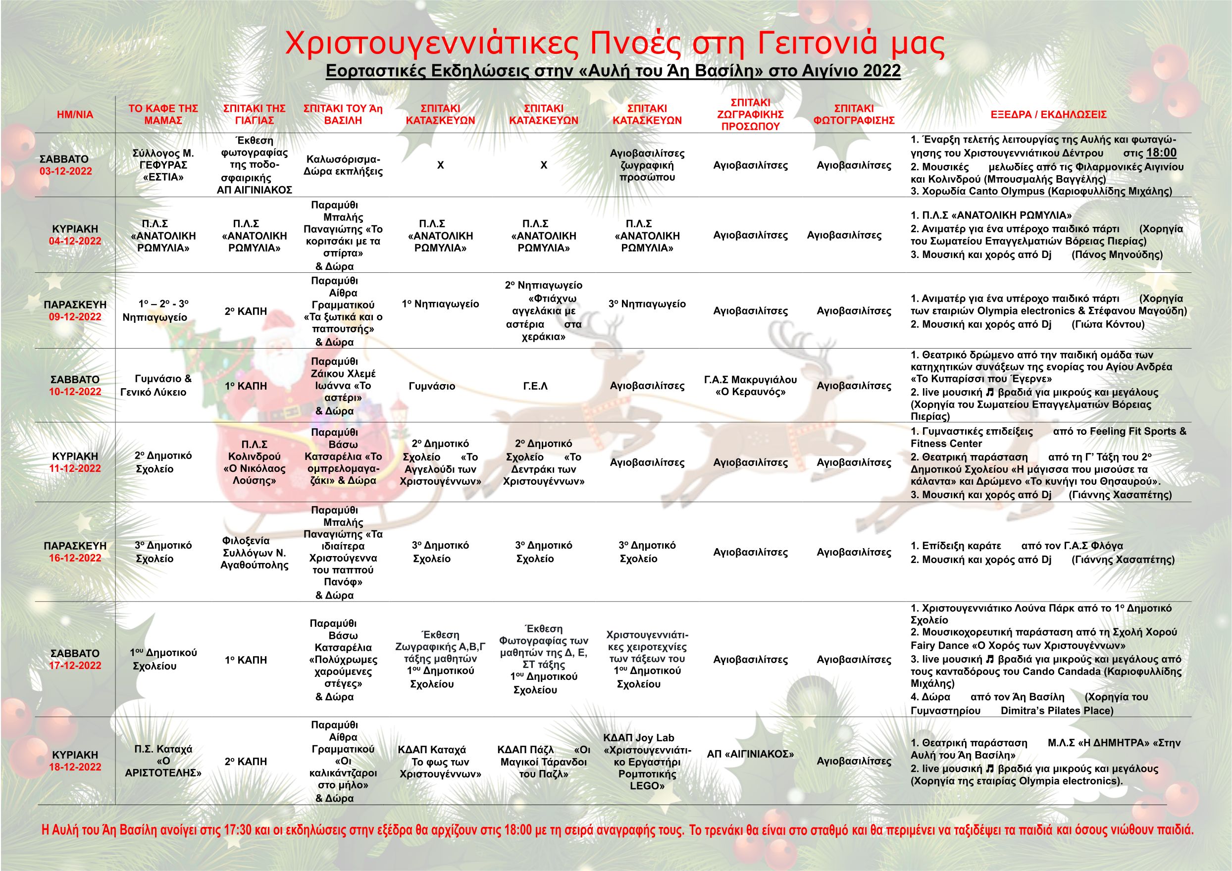 Έναρξη Χριστουγεννιάτικων εκδηλώσεων Σάββατο 3-12-2022 και ώρα 18:00 στο Αιγίνιο στην "Αυλή του Αη Βασίλη" στον αύλειο χώρο του Αγίου Αθανασίου