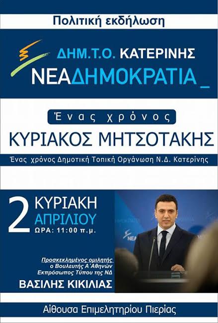 Η Δημοτική Τοπική Οργάνωση Ν.Δ. Κατερίνης, συμπληρώνοντας τον πρώτο χρόνο θητείας της οργανώνει πολιτική εκδήλωση με θέμα: «Ένας χρόνος Κυριάκος Μητσοτάκης»με προσκεκλημένο ομιλητή τον Εκπρόσωπο Τύπου της Ν.Δ., Βουλευτή Α’ Αθηνών Βασίλη Κικίλια.
