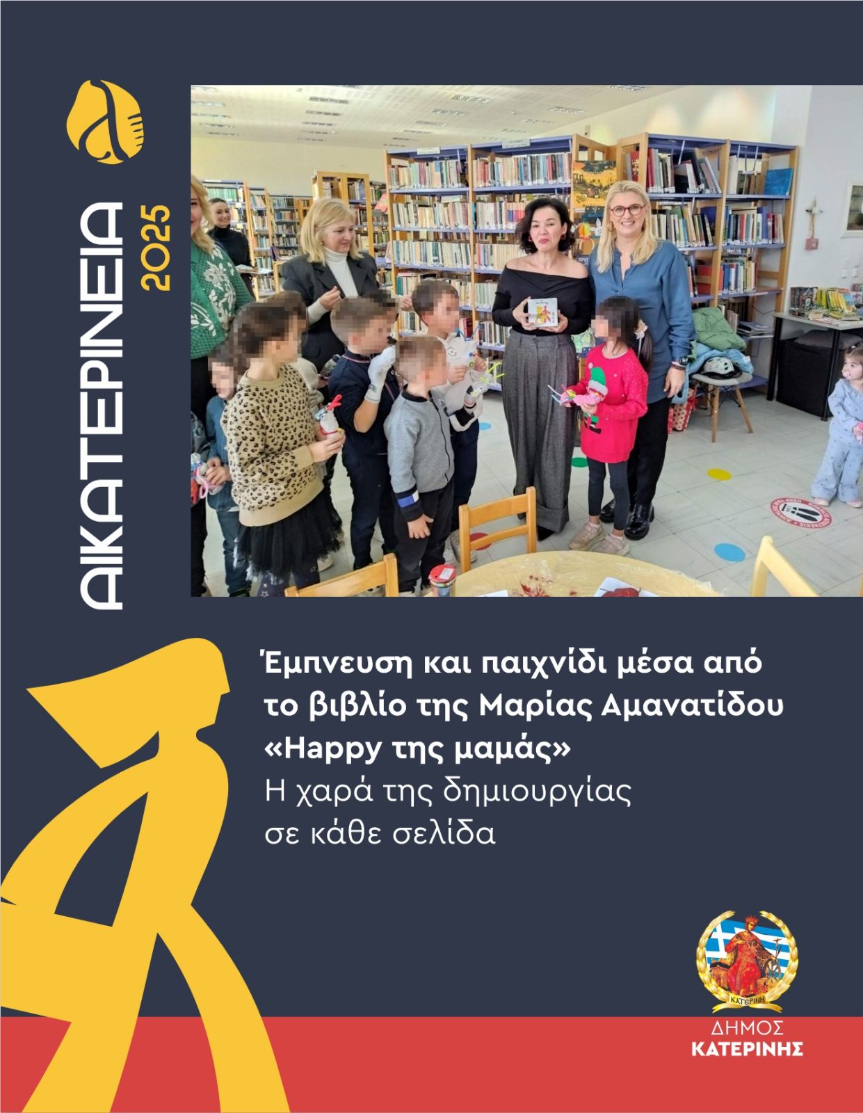 Η εμπλουτισμένη έκδοση του βιβλίου της Μαρίας Αμανατίδου «Happy της μαμάς» παρουσιάστηκε το πρωί της Κυριακής 01-12-2025, στη Δημοτική Βιβλιοθήκη, στο πλαίσιο των εκδηλώσεων «ΑΙΚΑΤΕΡΙΝΕΙΑ». Με κέφι και δημιουργική διάθεση, η γνωστή δημοσιογράφος, ραδιοφωνική παραγωγός  και συγγραφέας μίλησε για ένα βιβλίο - πρόσκληση σε παιχνίδι, φαντασία και χαρά, γεμάτο ιδέες για γονείς, θείους, νονούς και όλους όσοι θέλουν να περνούν ποιοτικό χρόνο με τα παιδιά.