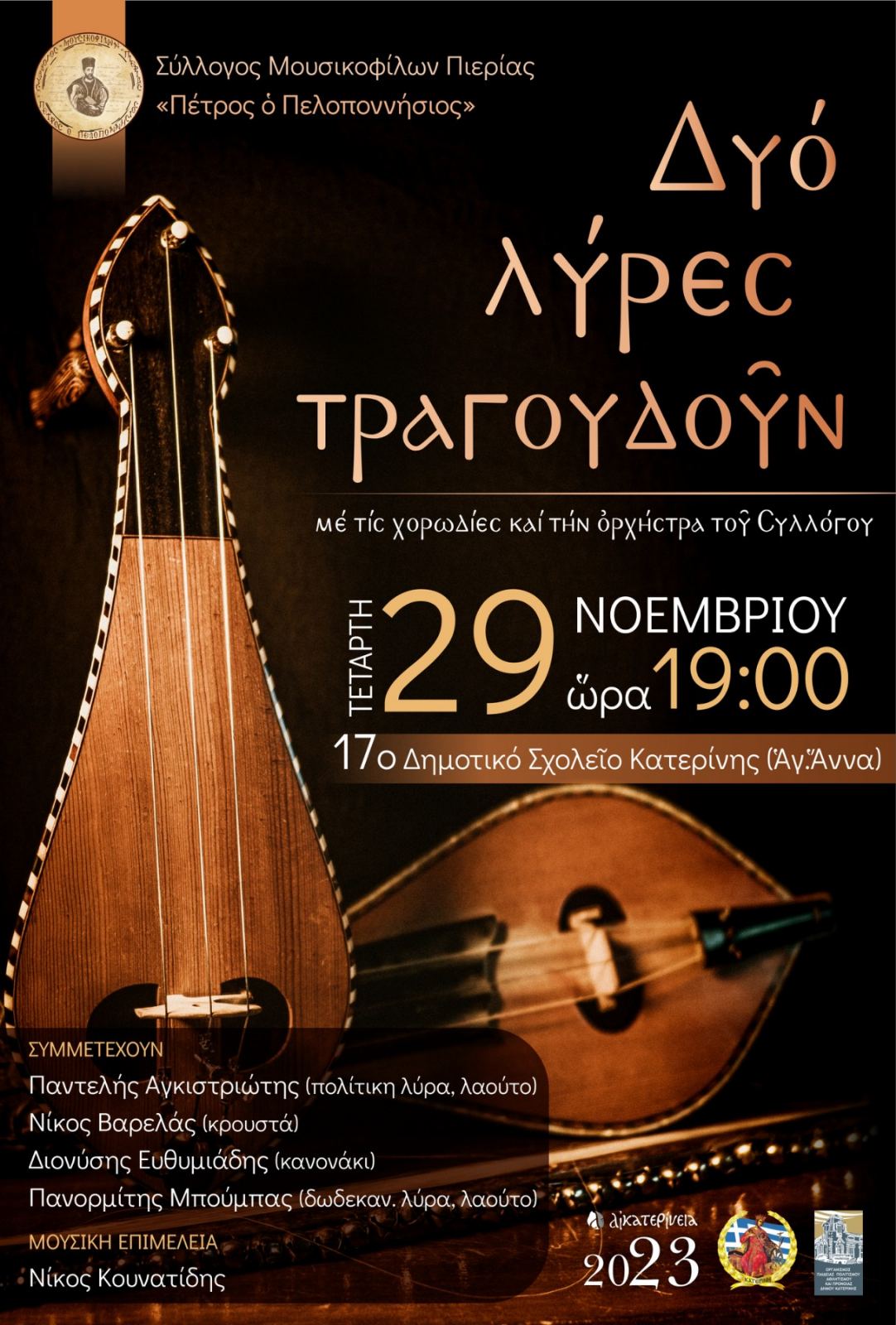 Με μια συναυλία-γιορτή, όπου δυο λύρες "τραγουδούν" πολίτικα και δωδεκανησιακά ακούσματα, μαζί με τους μικρούς και τους μεγάλους του χορωδούς & οργανοπαίχτες, ο Σύλλογος Μουσικοφίλων Πιερίας "Πέτρος ο Πελοποννήσιος" συμμετέχει στα φετινά Αικατερίνεια.