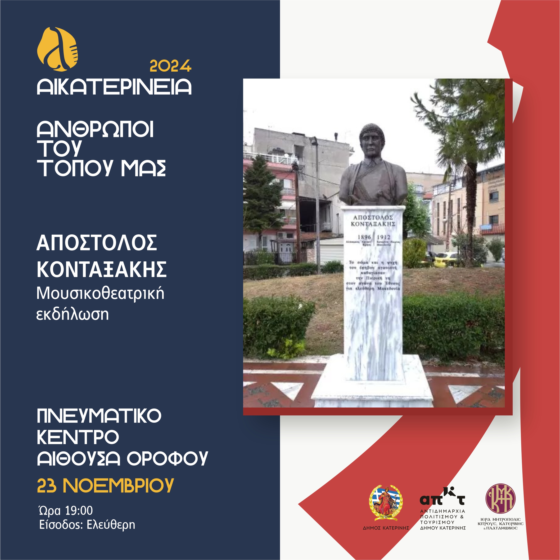 Η μουσικοθεατρική εκδήλωση παρουσίασης του μελοποιημένου παραμυθιού για τη ζωή & τη θυσία κατά την απελευθέρωση της Κατερίνης του 16χρονου Κρητικού Μακεδονομάχου, θα πραγματοποιηθεί το Σάββατο 23 Νοεμβρίου & ώρα 19:00, στο Πνευματικό Κέντρο Δ. Κατερίνης (αίθουσα ορόφου).