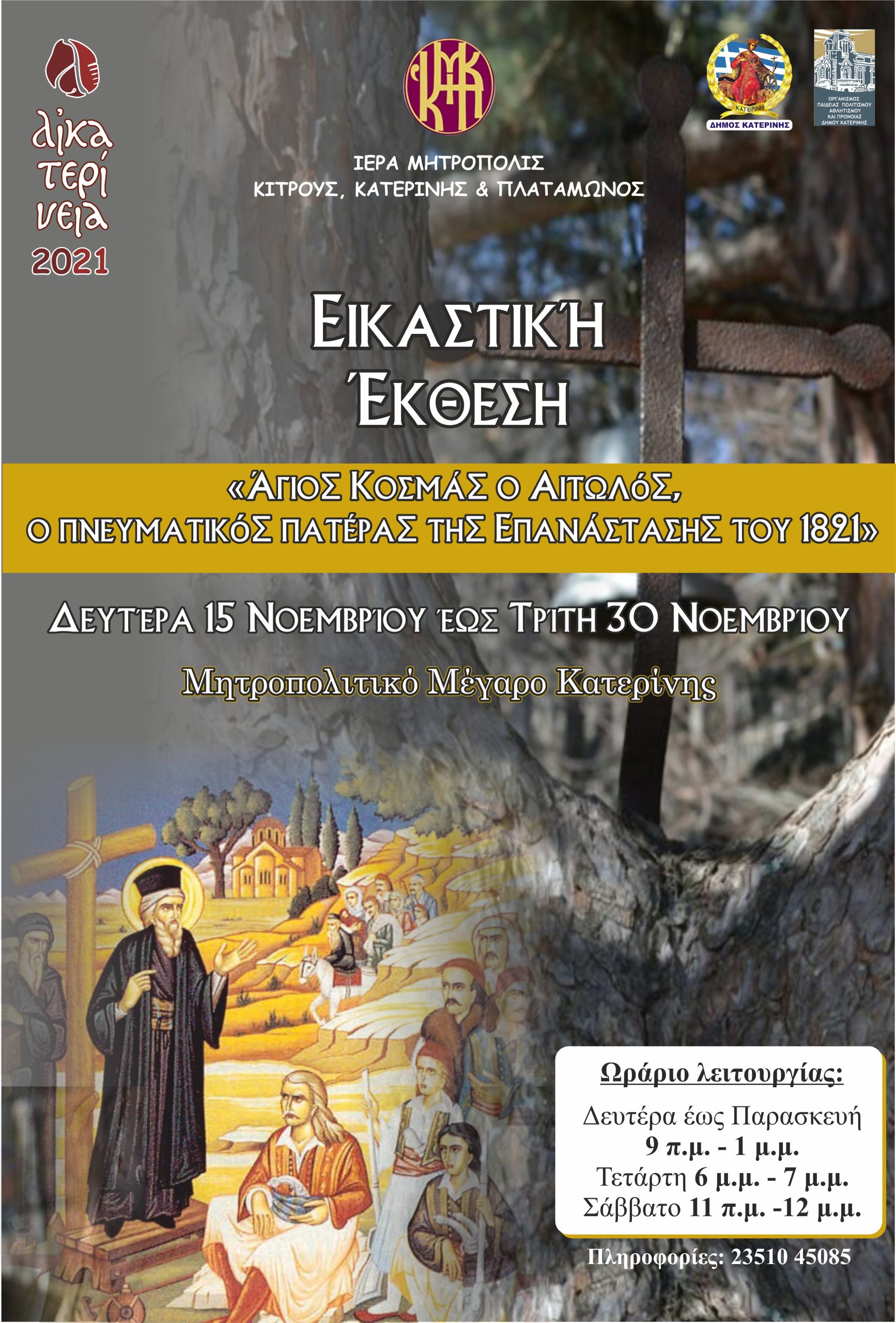 Εικόνες του μεγάλου εθνοιεραποστόλου Άγιου Κοσμά του Αιτωλού, από Ιερούς Ναούς της πόλης και της ευρύτερης περιοχής του Νομού Πιερίας, που σπάνια έχει κανείς την ευκαιρία να τις βλέπει και να τις αποθαυμάζει στον ίδιο χώρο. Επίσης, φωτογραφικό υλικό από περιοχές της Πιερίας, που επισκέφτηκε ο Πατροκοσμάς περιλαμβάνει η έκθεση, την επιμέλεια της οποίας υπογράφει, η Δρ. Βυζαντινής Αρχαιολογίας Αθηνά Τσιγκαροπούλου. Η έκθεση θα φιλοξενηθεί στο Μητροπολιτικό Μέγαρο Κατερίνης από τις 15 έως τις 30 Νοεμβρίου.