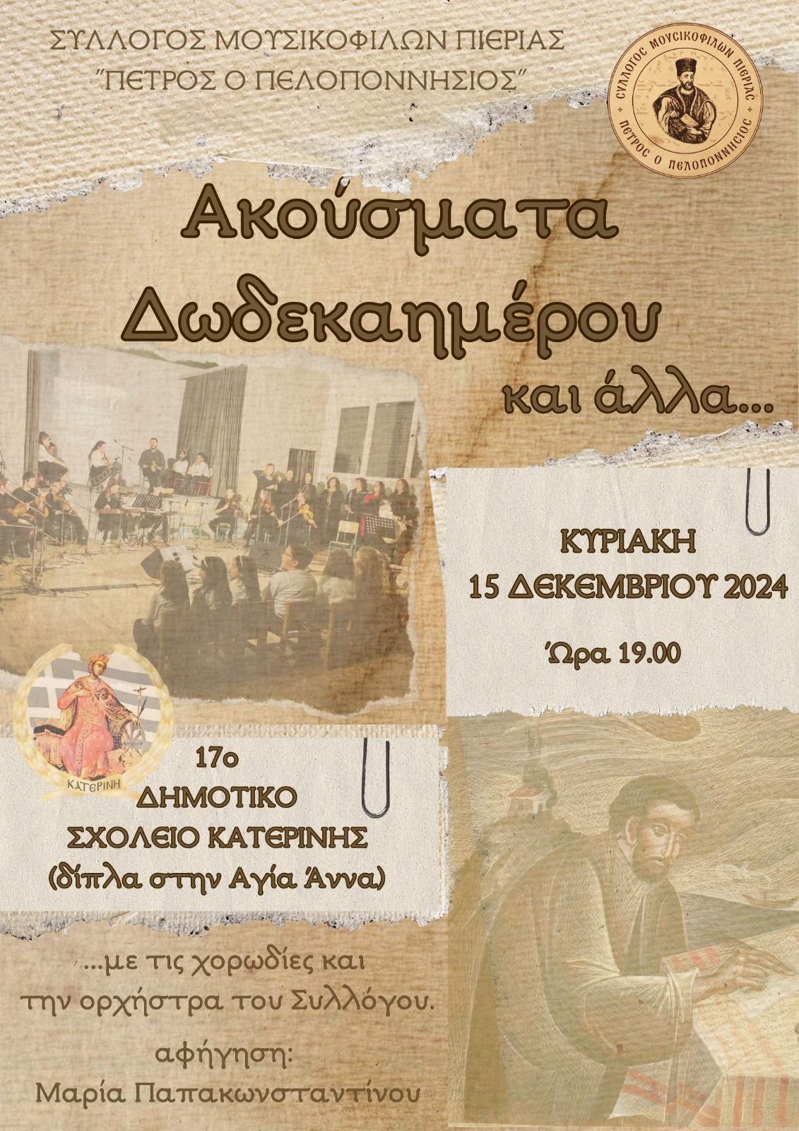 Η εκδήλωση θα πραγματοποιηθεί την Κυριακή 15 Δεκεμβρίου 2024 και ώρα 19.00, στο 17ο Δημοτικό Σχολείο Κατερίνης.