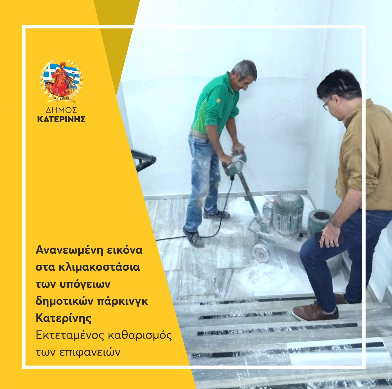 Σε εκτεταμένο καθαρισμό των μαρμάρων στα κλιμακοστάσια των υπόγειων χώρων στάθμευσης P1 και P2, στην πλατεία Δημαρχείου Κατερίνης, προχώρησε η ΠΟΛΙΣ Α.Ε.(δημοτικά πάρκινγκ), στο πλαίσιο της συνεχούς αναβάθμισης των δημοτικών υποδομών.