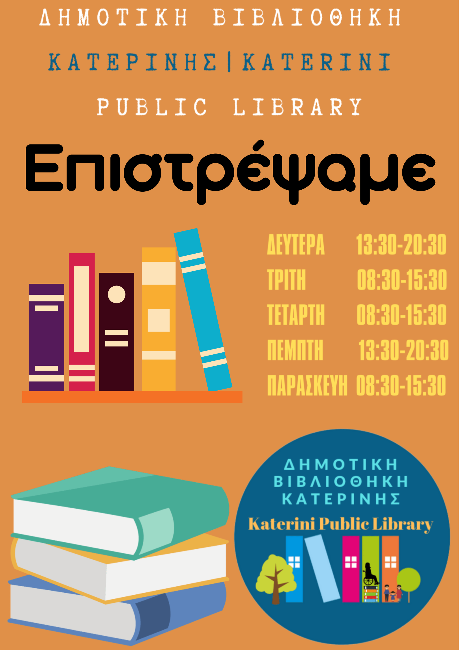 Σας ενημερώνουμε ότι επαναλειτουργεί η Δημοτική Βιβλιοθήκη Κατερίνης, για την επιλογή, το δανεισμό και την επιστροφή βιβλίων. Λόγω της πανδημίας, για βιβλία που είναι εκπρόθεσμα, δεν θα υπάρξουν χρεώσεις. Το αναγνωστήριο, ένα τμήμα του παιδικού τμήματος θα παραμείνουν κλειστά και η ακριβής ημερομηνία επανέναρξης της λειτουργίας τους θα γνωστοποιηθούν έγκαιρα με νεότερη ανακοίνωση.