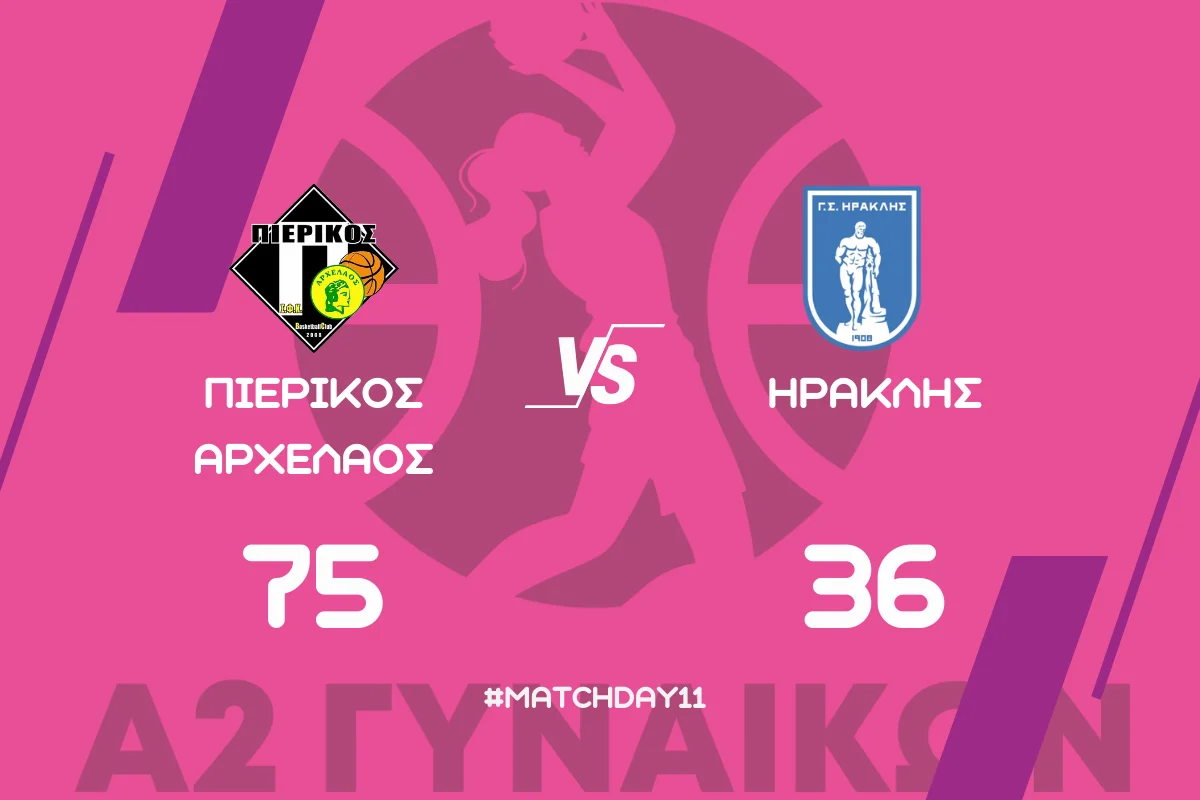Ο Πιερικός Αρχέλαος επικράτησε με 75-36 επί του Ηρακλή στο Κλειστό Γυμναστήριο Σιδηροδρομικού Σταθμού Κατερίνης σε αγώνα για την 11η αγωνιστική του 2ου ομίλου της Α2 Εθνικής Κατηγορίας Γυναικών.