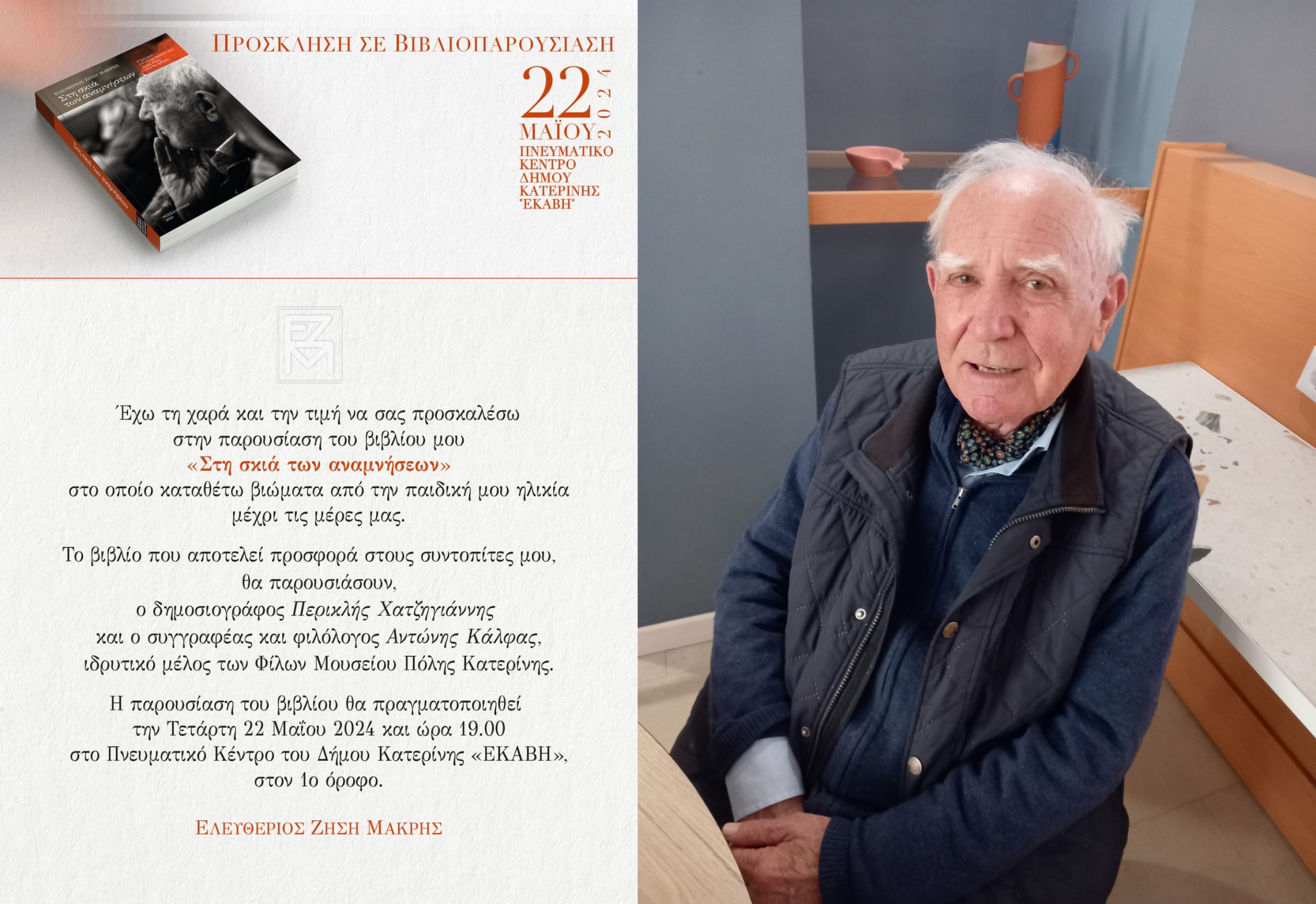Τη βιωματική του προσωπογραφία θα καταθέσει στο πόνημά του με τίτλο «Στη σκιά των αναμνήσεων» ο Κατερινιώτης Ελευθέριος Ζήση Μακρή, το οποίο θα παρουσιάσει την Τετάρτη 22 Μαΐου 2024, στις 7 μ. μ, στο Πνευματικό Κέντρο Κατερίνης (1ος όροφος).