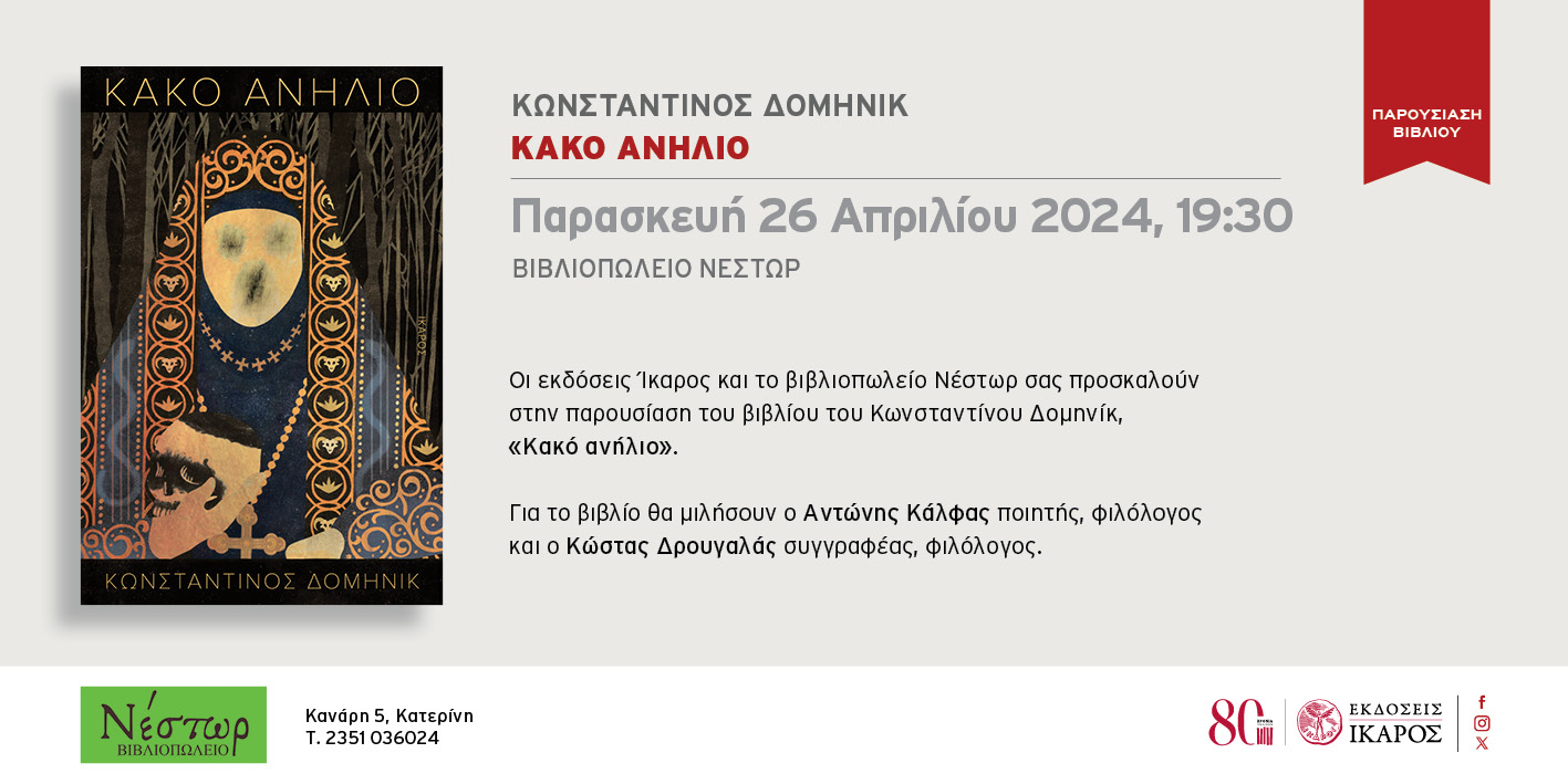 Βιβλιοπαρουσίαση στις 26-4-2024 στο «Νέστωρ» Κωνσταντίνος Δομηνίκ «Κακό Ανήλιο»