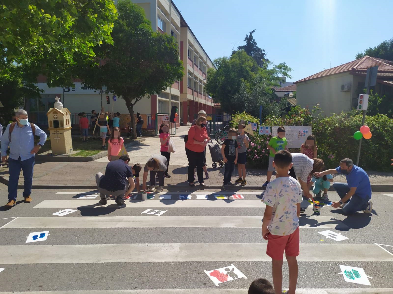Από νωρίς το πρωί με τη φροντίδα της Δημοτικής Αστυνομίας η οδός Μαραθώνος (στο ύψος του σχολείου) είχε κλείσει για τα οχήματα, δίνοντας την ευκαιρία σε εκπαιδευτικούς, μαθητές και γονείς, να εμπλουτίσουν με πολύχρωμα σχέδια την διάβαση πεζών. Στο σημείο, έγινε και έκθεση έργων ζωγραφικής των μαθητών, μέσα από την οποία τα παιδιά μετέφεραν την εικόνα που έχουν σχηματίσει για την κίνηση στην πόλη και τη συμπεριφορά οδηγών και πεζών με τη δική τους, ιδιαίτερη ματιά.