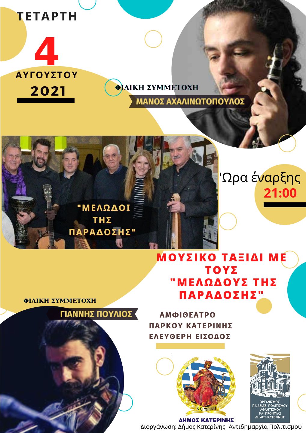 Βραδιά παραδοσιακής ελληνικής μουσικής παρουσιάζουν οι «Μελωδοί της Παράδοσης», την Τετάρτη 4 Αυγούστου, στις 9.00 το βράδυ, στο Αμφιθέατρο Πάρκου Κατερίνης.