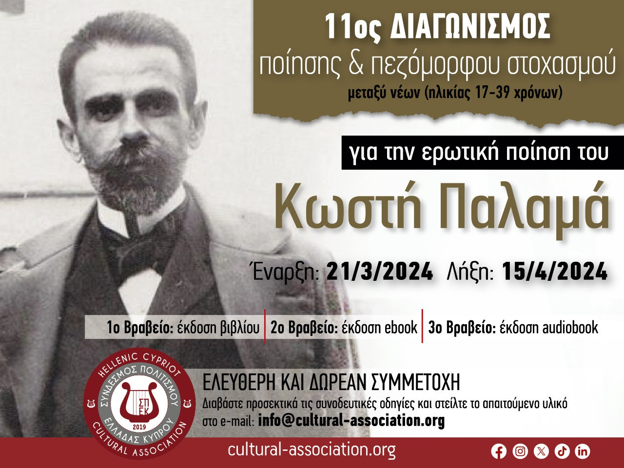 Ο Σύνδεσμος Πολιτισμού Ελλάδας Κύπρου | Σ.Π.Ε.Κ. τιμά την Παγκόσμια Ημέρα Ποίησης και σε συνεργασία με τις εκδόσεις Αρχύτας, προκηρύσσει 11ο Διαγωνισμό ποίησης & πεζόμορφου στοχασμού “Για την ερωτική ποίηση του ΚΩΣΤΗ ΠΑΛΑΜΑ”. Ο 11ος Διαγωνισμός αρχίζει στις 21/03/2024 και λήγει στις 15/04/2024. Οι συμμετέχοντες δεν καταβάλλουν έξοδα συμμετοχής στον Διαγωνισμό.
