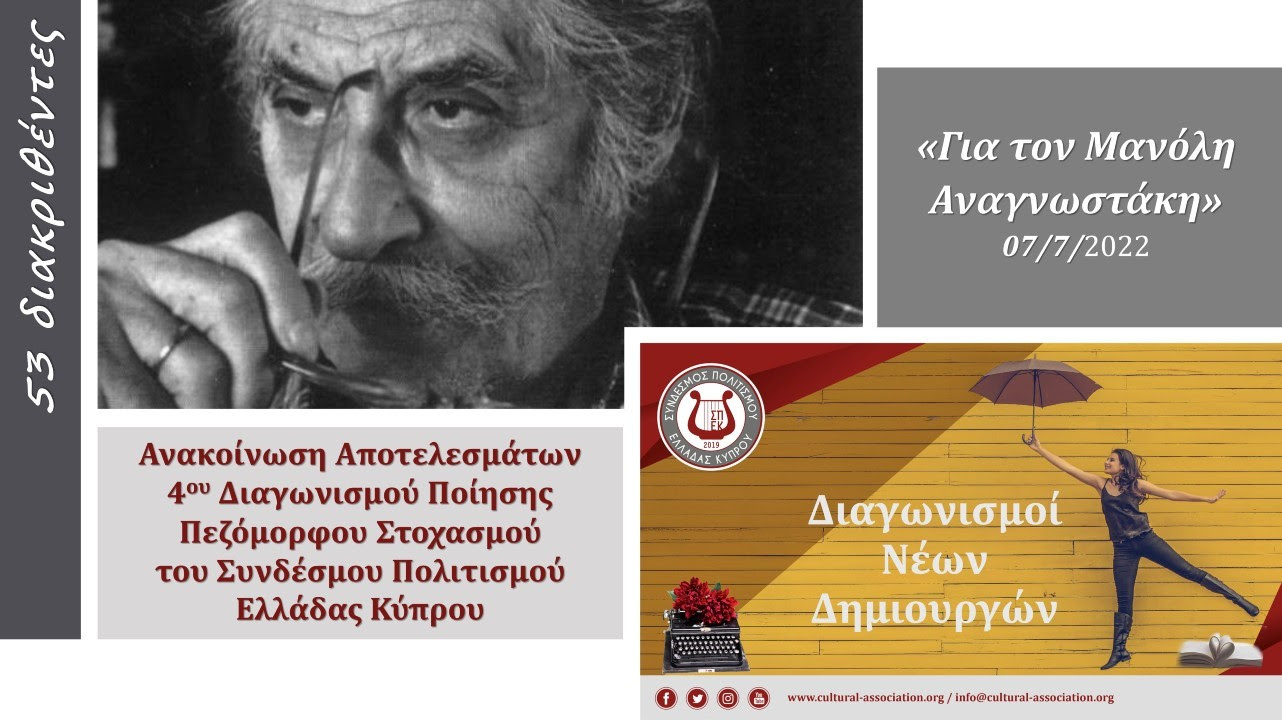 Με ισχυρή συμμετοχή ολοκληρώθηκε επιτυχώς ο 5ος Διαγωνισμός ποίησης - πεζόμορφου ποιητικού στοχασμού μεταξύ νέων (ηλικίας 17-39 χρόνων) με θέμα «Ανθολογία Ποίησης Νέων ΣΠΕΚ για τον Μανόλη Αναγνωστάκη», που πραγματοποιήθηκε από τον Σύνδεσμο Πολιτισμού Ελλάδας Κύπρου | ΣΠΕΚ σε συνεργασία με τις εκδόσεις Αρχύτας, ο οποίος άρχισε στις 21/3/2022, Παγκόσμια Ημέρα Βιβλίου, και έληξε στις 14/4/2022. Ως Σύνδεσμος Πολιτισμού Ελλάδας Κύπρου, λάβαμε περί των 120 έργων από νέες και νέους (17-39 χρόνων) Ελλαδίτες, Κύπριους και Απόδημους. Ειδική Επιτροπή, βάσει κριτηρίων που διέπουν τις αρχές της λογοτεχνίας, της ποίησης και της γλώσσας, αλλά και σύμφωνα με πρόσθετα κοινωνικά και πολιτισμικά κριτήρια, μελέτησε τις συμμετοχές που κατατέθηκαν και επέλεξε τις 53 που ξεχώρισαν. Τα έργα που διακρίθηκαν, επιλέχθηκαν να ενταχθούν σε ειδική έντυπη ανθολογία «Για τον Μανόλη Αναγνωστάκη», η οποία θα κυκλοφορήσει μετά τις 20 Σεπτεμβρίου 2022 από τον Σύνδεσμο Πολιτισμού Ελλάδας Κύπρου σε συνεργασία με τις εκδόσεις Αρχύτας.