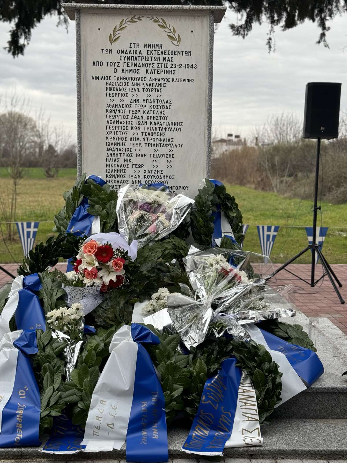 Με επιμνημόσυνη δέηση από τον Εφημέριο του Ιερού Ναού Αγίου Χαραλάμπους, π. Κυριάκο Κοκελίδη και κατάθεση στεφάνων από εκπροσώπους αρχών, φορέων, συλλόγων, καθώς και από συγγενείς των θυμάτων στο μνημείο πεσόντων στον Σιδηροδρομικό Σταθμό (Οδός Διγενή Ακρίτα), τιμήθηκε σήμερα το πρωί, η επέτειος της ομαδικής εκτέλεσης από τους Γερμανούς 40 Ελλήνων πατριωτών, με πρώτο τον αείμνηστο Δήμαρχο Κατερίνης, Αιμίλιο Ξανθόπουλο, το Φεβρουάριο του 1943.