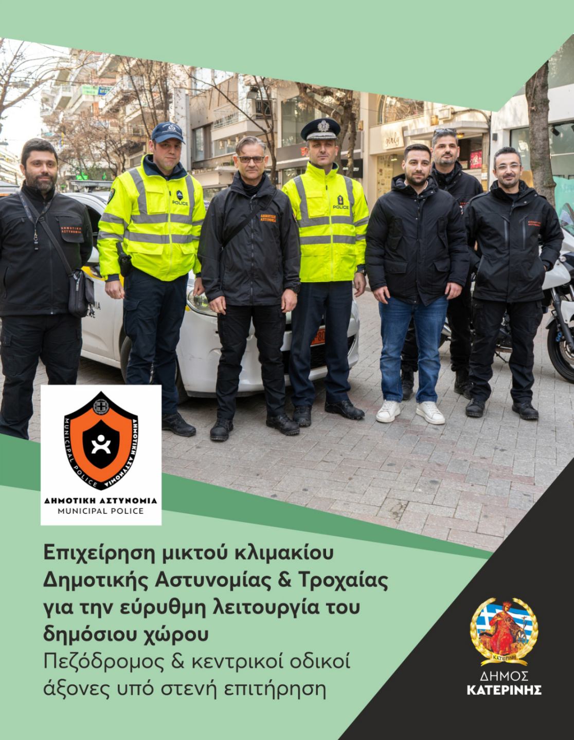 Μήνυμα προστασίας του δημόσιου χώρου, εύρυθμης λειτουργίας των πεζόδρομων και σεβασμού προς τους δημότες έστειλε σήμερα η ευρεία κοινή επιχείρηση μικτού κλιμακίου της Δημοτικής Αστυνομίας, σε συνεργασία με την Τροχαία Κατερίνης. Πεζόδρομος και κεντρικοί οδικοί άξονες τέθηκαν υπό στενή επιτήρηση, με στόχο την αντιμετώπιση της αντικοινωνικής και παράνομης στάθμευσης και την απελευθέρωση των πεζοδρομίων.