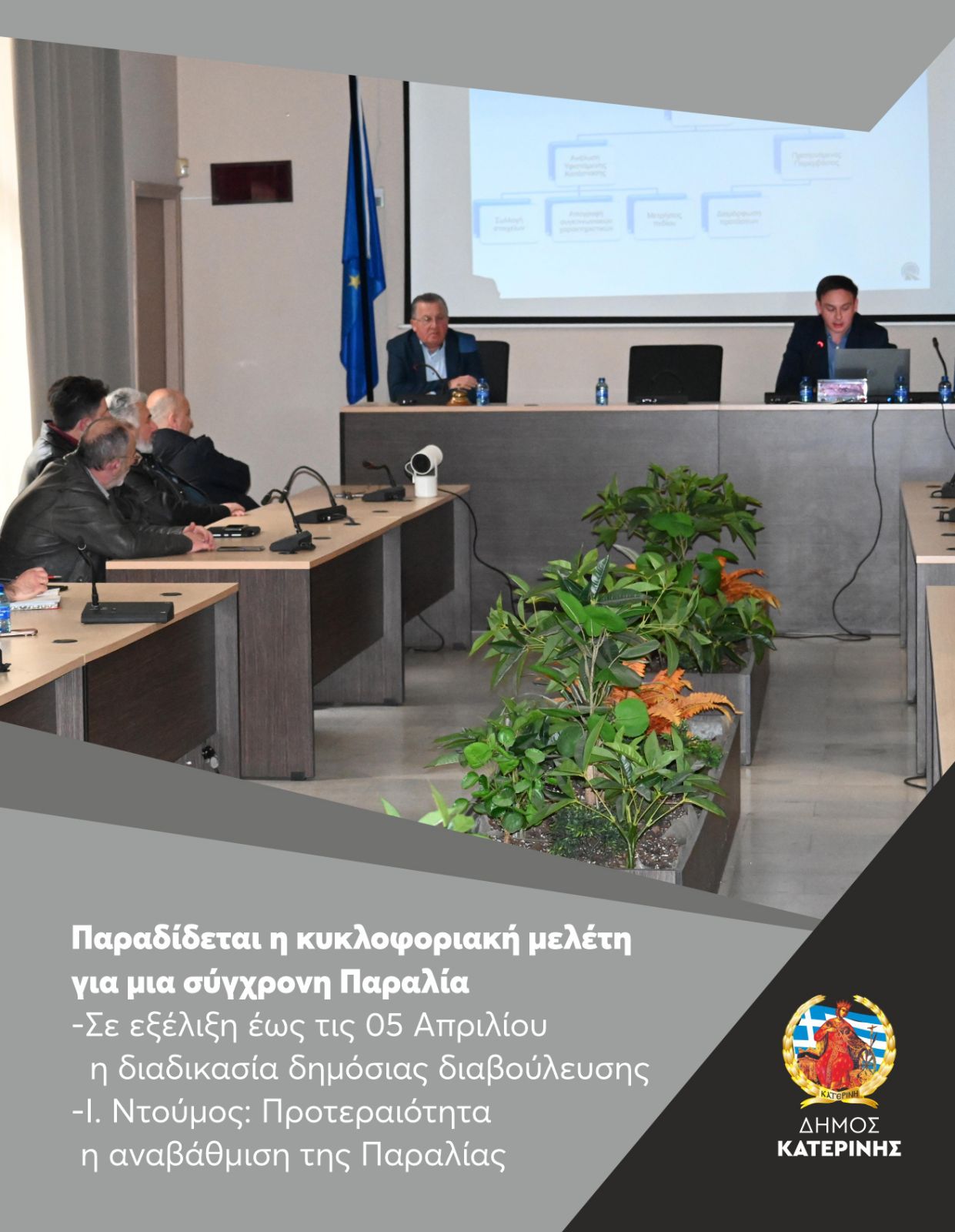 Στο στάδιο οριστικής Διαβούλευσης βρίσκεται η εκπονηθείσα Κυκλοφοριακή Μελέτη για την Κοινότητα της Παραλίας Κατερίνης, σύμφωνα με όσα ανακοίνωσε ο Καθηγητής Συγκοινωνιολογίας Πανεπιστημίου Θεσσαλίας, Νικόλαος Ηλιού, κατά τη διάρκεια παρουσίασής της, σε φορείς και κατοίκους της Παραλίας, την περασμένη Παρασκευή 20/3/2026, στην αίθουσα συνεδριάσεων του Δ.Σ. Κατερίνης.