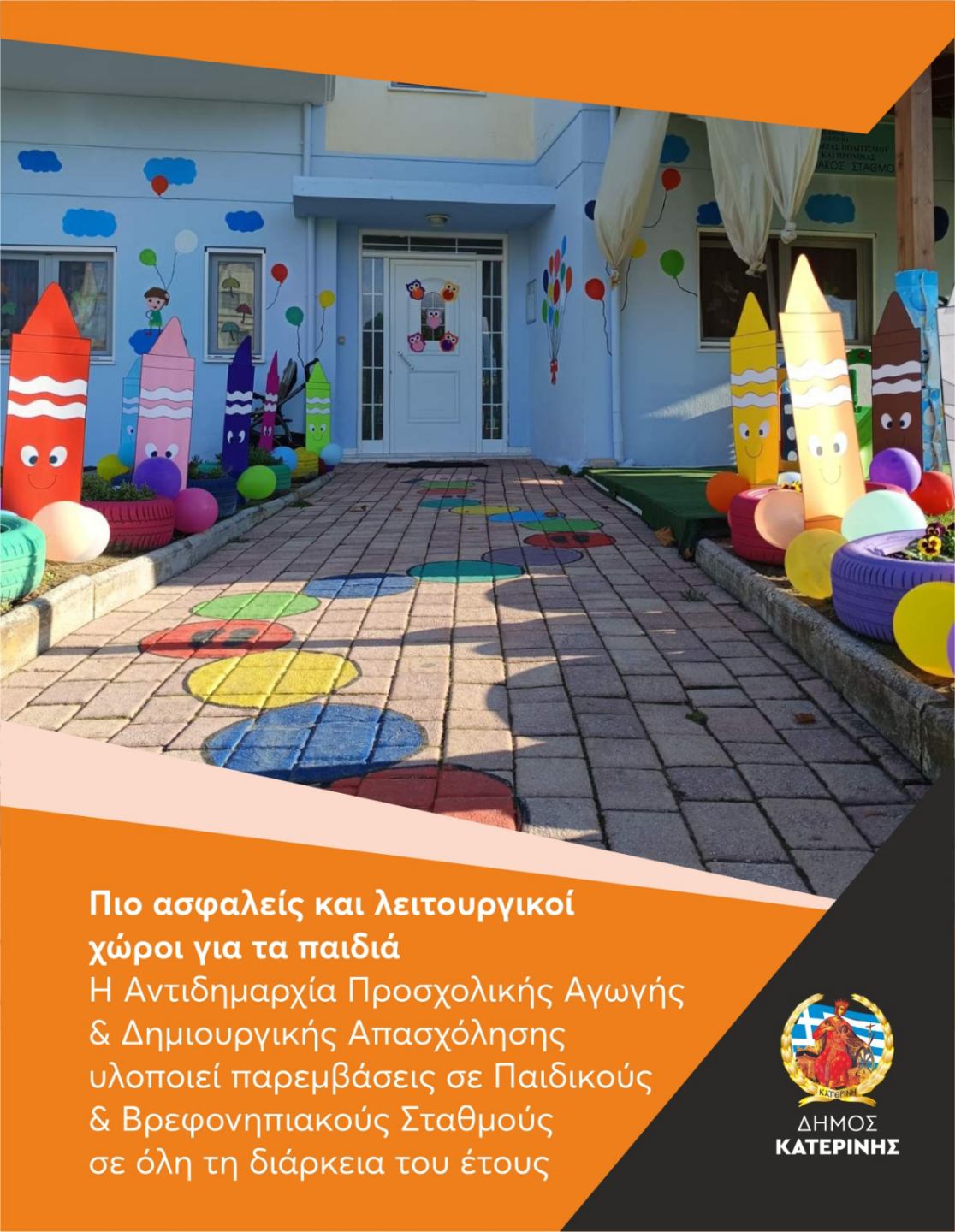 Με σταθερό προσανατολισμό στη φροντίδα και την ασφάλεια των παιδιών, ο Δήμος Κατερίνης συνεχίζει συστηματικά τις παρεμβάσεις βελτίωσης στους Παιδικούς και Βρεφονηπιακούς Σταθμούς, καθώς και στα ΚΔΑΠ-ΜΕΑ. Οι εργασίες αυτές, που υλοποιούνται όλο τον χρόνο από την Αντιδημαρχία Υπηρεσιών Προσχολικής Αγωγής & Δημιουργικής Απασχόλησης, στοχεύουν στη δημιουργία λειτουργικών και φιλόξενων εγκαταστάσεων για το δημιουργικό παιχνίδι και την καθημερινή δραστηριότητα των παιδιών.