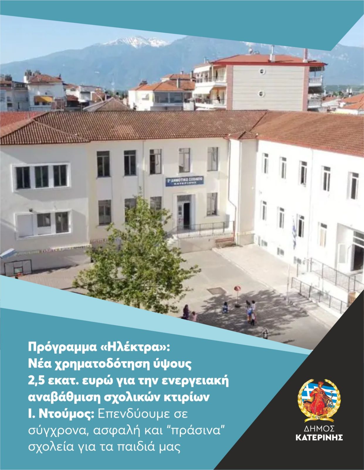 Νέα χρηματοδότηση ύψους 2.495.288,76 ευρώ στο πλαίσιο του Προγράμματος «Ηλέκτρα» του Υπουργείου Περιβάλλοντος και Ενέργειας, για την ενεργειακή αναβάθμιση και ριζική ανακαίνιση τεσσάρων ακόμη σχολικών κτιρίων, εξασφάλισε ο Δήμος Κατερίνης.