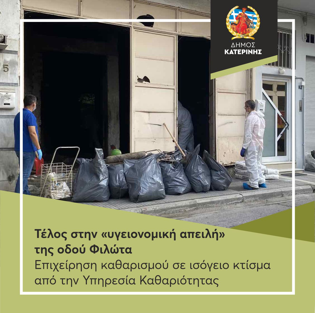 Μια υγειονομική απειλή, που επί χρόνια ταλαιπωρούσε τους κατοίκους της περιοχής «Τουρμπές» (Τζαμί), αντιμετωπίσθηκε αποτελεσματικά χάρη στην παρέμβαση της Υπηρεσίας Καθαριότητας του Δήμου Κατερίνης. Σε ισόγειο κτίσμα της οδού Φιλώτα είχαν συσσωρευτεί απορρίμματα κάθε είδους, προκαλώντας έντονη δυσοσμία και κίνδυνο για τη δημόσια υγεία.