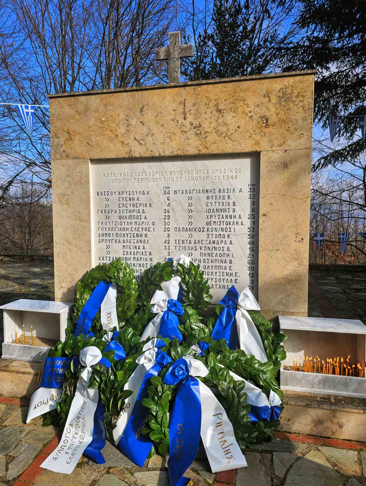 Ένα αγιοκέρι μνήμης, συγκίνηση, επετειακή ομιλία και καταθέσεις στεφάνων στην εκδήλωση Τιμής των εκτελεσθέντων Ελατοχωριτών από τους από τους Γερμανούς στις 27 Ιανουαρίου 1944. Η εκδήλωση πραγματοποιήθηκε σήμερα το πρωί στο Ελατοχώρι, από τον Δήμο Κατερίνης και την Τοπική Κοινότητα και περιλάμβανε Ιερατικό συλλείτουργο στον Ιερό Ναό Αγίων Κωνσταντίνου και Ελένης, επιμνημόσυνη δέηση και ομιλία για το χρονικό της ημέρας από τον κ. Ευάγγελο Γκουτζιούλη.