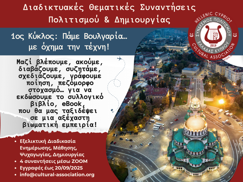 Μέσα από 4 ζωντανές διαδικτυακές συναντήσεις, σας ταξιδεύουμε στη Βουλγαρία μέσω λογοτεχνίας, τέχνης. κουζίνας, λαογραφίας, παράδοσης και σύγχρονης ζωής. Δημιουργούμε μαζί ποίηση, πεζόμορφο στοχασμό, μικρές ιστορίες και φτιάχνουμε ένα δίγλωσσο eBook (ελληνικά–βουλγαρικά), συμμετέχουμε σε εκδηλώσεις με τοπικούς φορείς και ολοκληρώνουμε την εμπειρία με πολιτιστική αποστολή στη Βουλγαρία. Πρόσκληση: Γίνετε μέρος αυτού του edutainment ταξιδιού και δημιουργήστε πολιτιστικές γέφυρες: ΔΙΑΒΑΖΩ ΕΔΩ ΚΑΙ ΣΥΜΜΕΤΕΧΩ https://cultural-association.org/%CE%B4%CE%B9%CE%B1%CE%BB%CE%AD%CE%BE%CE%B5%CE%B9%CF%82-%CF%83%CE%B5%CE%BC%CE%B9%CE%BD%CE%AC%CF%81%CE%B9%CE%B1/%CF%83%CE%B5%CE%BC%CE%B9%CE%BD%CE%AC%CF%81%CE%B9%CE%BF_%CE%B2%CE%BF%CF%85%CE%BB%CE%B3%CE%B1%CF%81%CE%AF%CE%B1