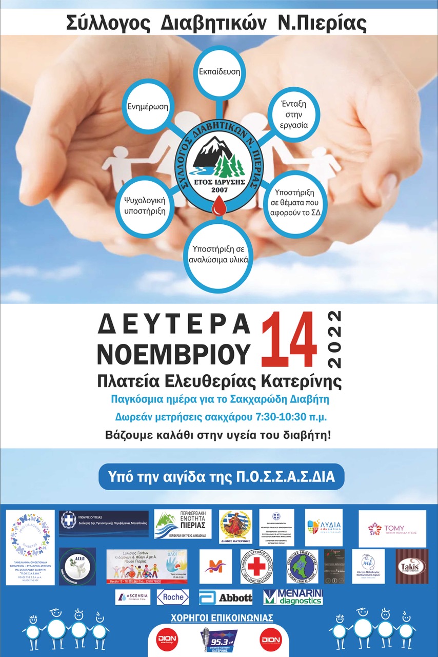 Τέλος, ο Σύλλογος Διαβητικών Νομού Πιερίας διοργανώνει το Σάββατο 19 Νοεμβρίου 2022 και ώρα 18:00, στο Πνευματικό Κέντρο του Δήμου Κατερίνης - αίθουσα Ά ορόφου, ημερίδα με θέμα: