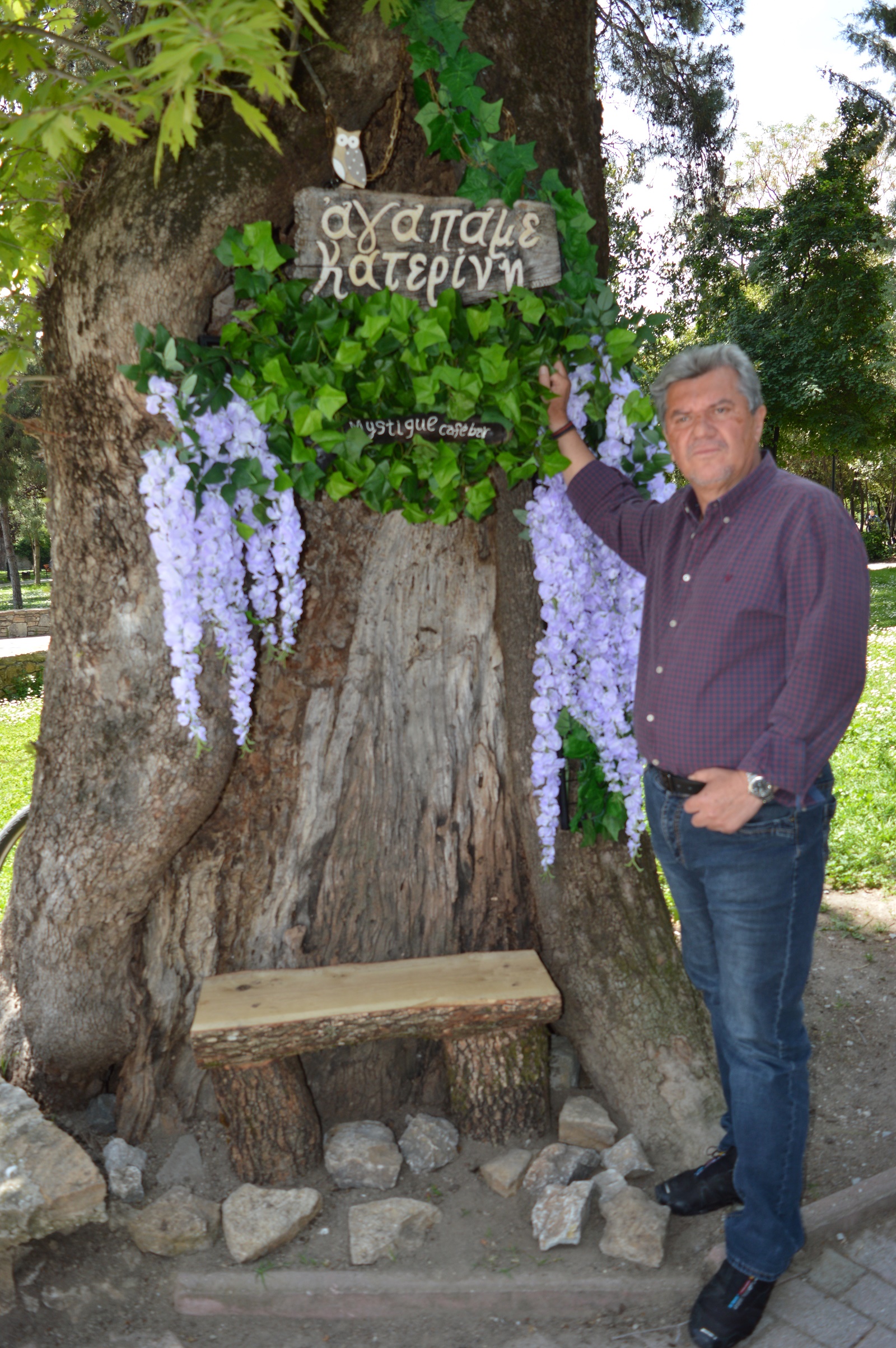 Το πρώτο σε κορμό αιωνόβιου πλάτανου, ανθοστολισμένο με λουλούδια της εποχής και με την εμβληματική επιγραφή υποδοχής «Αγαπάμε Κατερίνη», μας περιμένει για μια αναμνηστική φωτογράφιση στο μικρό του παγκάκι.