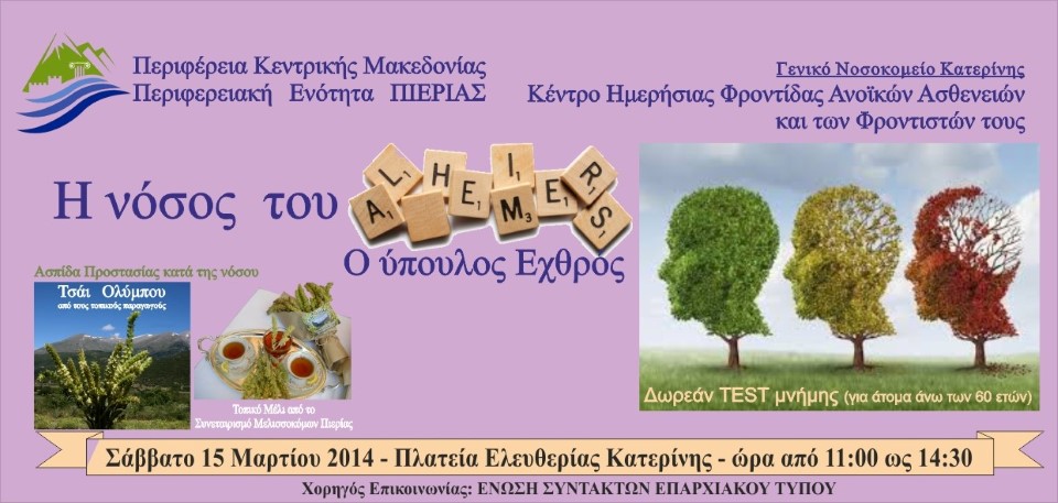 Η Π.Ε. Πιερίας σε συνεργασία, με το «Κέντρο Ημερήσιας Φροντίδας Ανοϊκών Ασθενειών και των Φροντιστών τους» που αποτελεί δομή του Ψυχιατρικού Τομέα του Γενικού Νοσοκομείου Κατερίνης και τους καλλιεργητές Τσαγιού Ολύμπου (Sideritis Scardica) της Πιερίας διοργανώνει εκδήλωση με θέμα «Η νόσος του Alzheimer, ο ΥΠΟΥΛΟΣ ΕΧΘΡΟΣ» στις 15 Μαρτίου 2014 στην κεντρική πλατεία της πόλης της Κατερίνης.