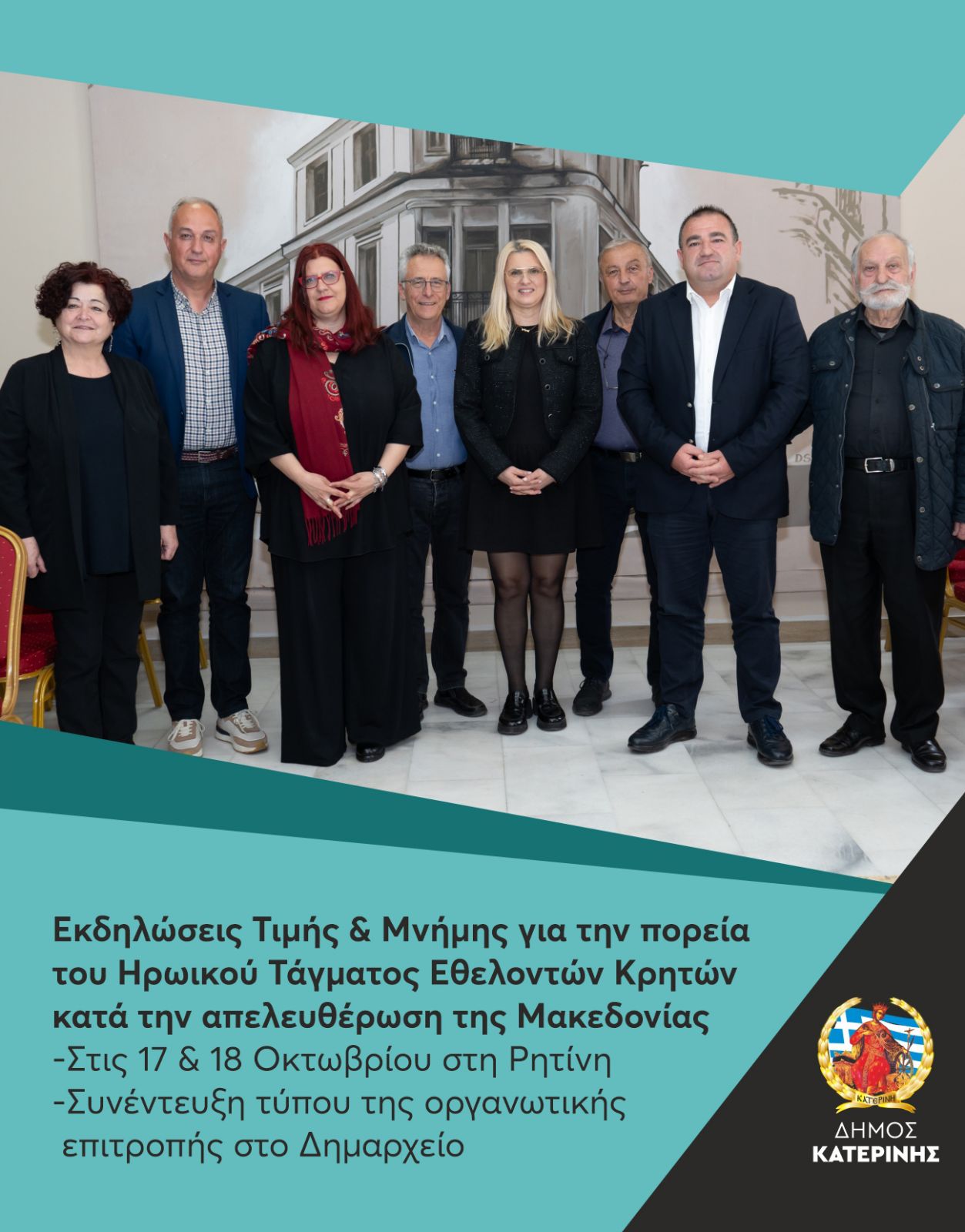Για τις εκδηλώσεις ανάδειξης της πορείας του Ηρωικού Τάγματος των Κρητών Εθελοντών στην ορεινή Πιερία και στην Μακεδονία την περίοδο 1912 - 1913, με επίκεντρο τη Ρητίνη (στις 16 Οκτωβρίου 1912), συνέντευξη παραχώρησαν σήμερα στο Δημαρχείο Κατερίνης προς τους εκπροσώπους των τοπικών μέσων ενημέρωσης, τα μέλη της οργανωτικής επιτροπής.