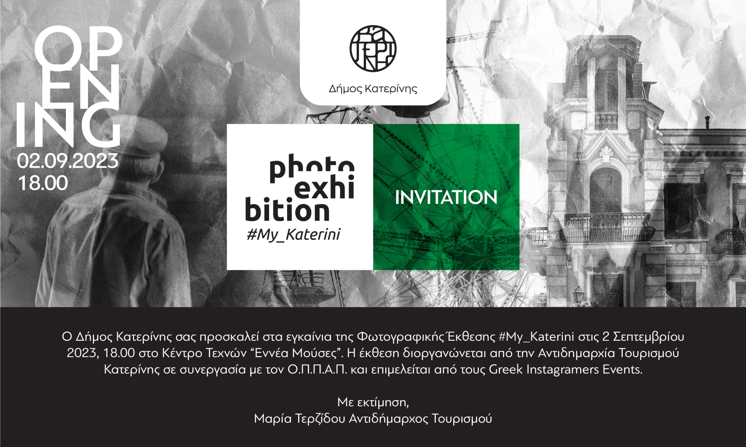 Ο Δήμος Κατερίνης σας προσκαλεί στα εγκαίνια της Φωτογραφικής Έκθεσης στις 2 Σεπτεμβρίου 2023, 18.00 στο Κέντρο Τεχνών "Εννέα Μούσες". Η έκθεση διοργανώνεται από την Αντιδημαρχία Τουρισμού Κατερίνης σε συνεργασία με τον Ο.Π.Π.Α.Π. και επιμελείται από τους Greek Instagramers Events.