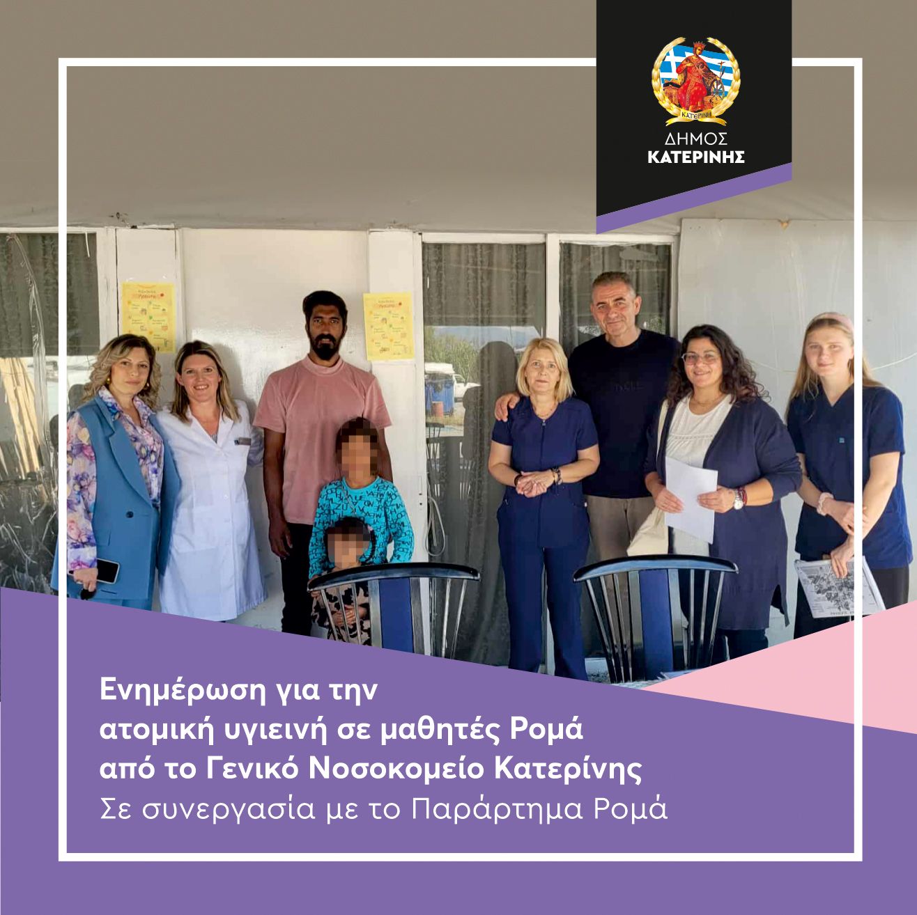 Δράση ενημέρωσης με θέμα την ατομική υγιεινή πραγματοποιήθηκε στον καταυλισμό Ρομά, από  ομάδα στελεχών του Γενικού Νοσοκομείου Κατερίνης, αποτελούμενη από νοσηλεύτρια λοιμώξεων, επισκέπτρια υγείας και νοσηλεύτρια πεδίου του ΕΟΔΥ.