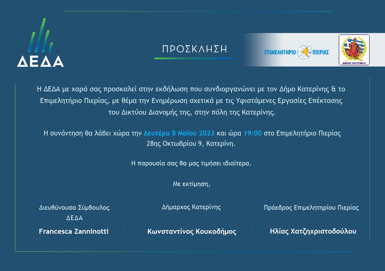 Ενημερωτική εκδήλωση για τις εργασίες επέκτασης του Δικτύου Διανομής της ΔΕΔΑ στην Κατερίνη - Δευτέρα 08/05 & ώρα 19:00 στο Επιμελητήριο Πιερίας