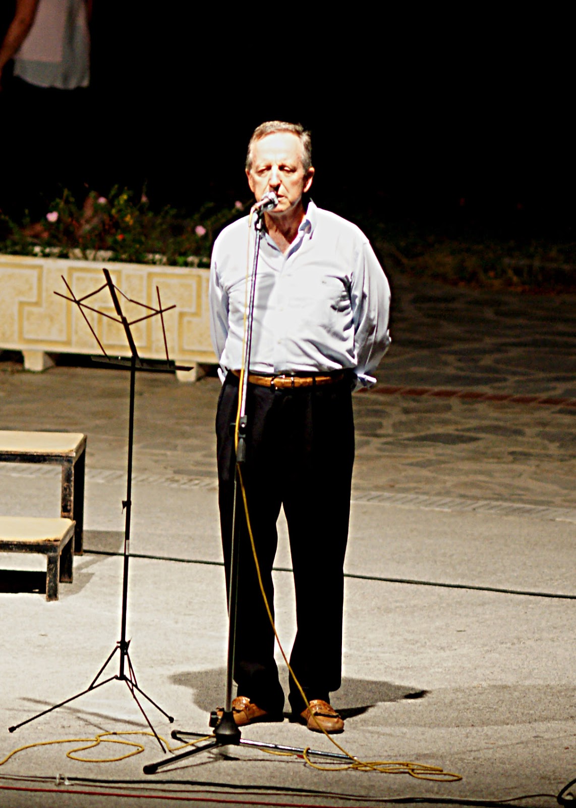 Οι σύντομοι χαιρετισμοί του Προέδρου της Χορωδίας μας Παναγιώτη Χρυσικού και του Δημάρχου Δήμου Δίου-Ολύμπου Κώστα Δημόπουλου, έδωσαν το στίγμα και την σπουδαιότητα της καλλιτεχνικής βραδιάς αλλά και περισσότερο χρόνο στους θεατές να απολαύσουν τις όμορφες καντάδες. Υπό το φως της πανσελήνου του Αυγούστου και κάτω απ΄τη σκιά του μυθικού Ολύμπου, ακούστηκαν όμορφα, ρομαντικά τραγούδια που ξύπνησαν πολλές μνήμες στους παλιούς.