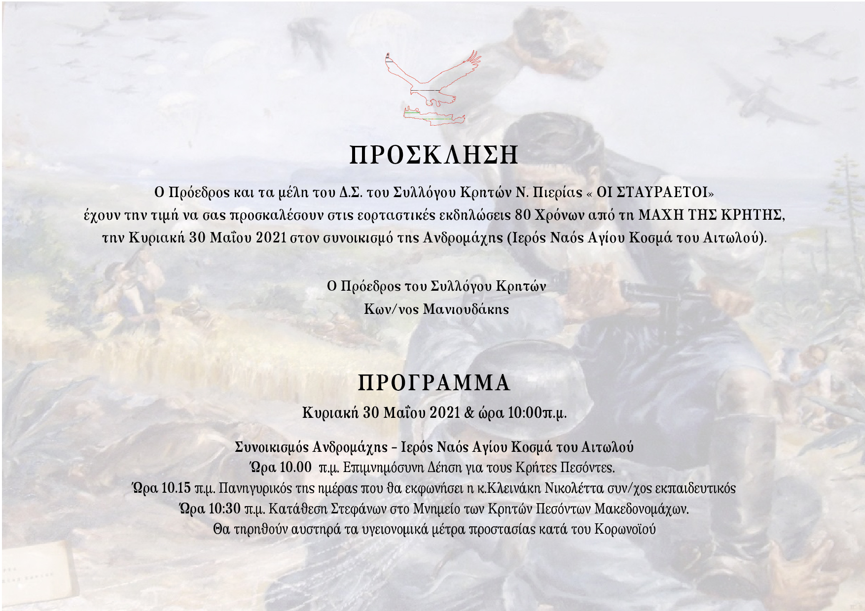 Εορταστικές εκδηλώσεις για τη Μάχη της Κρήτης – Πρόσκληση συλλόγου Κρητών Πιερίας “ΟΙ ΣΤΑΥΡΑΕΤΟΙ”