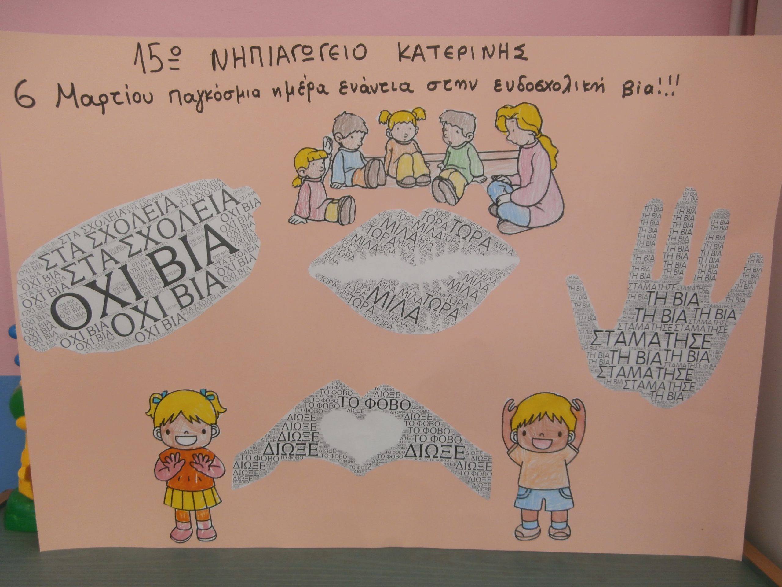 Το νοηματικό πλαίσιο στο οποίο η μαθητική οικογένεια του 15ου Νηπιαγωγείου Κατερίνης, κινήθηκε, ήταν: Τι είναι σχολικός εκφοβισμός, ο νταής και το θύμα και πως αντιδρώ στο σχολικό εκφοβισμό.
