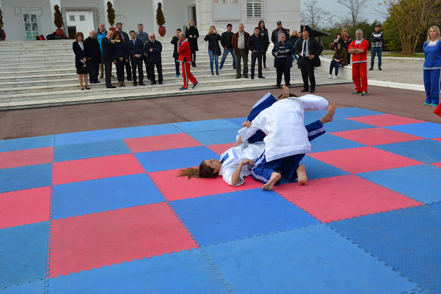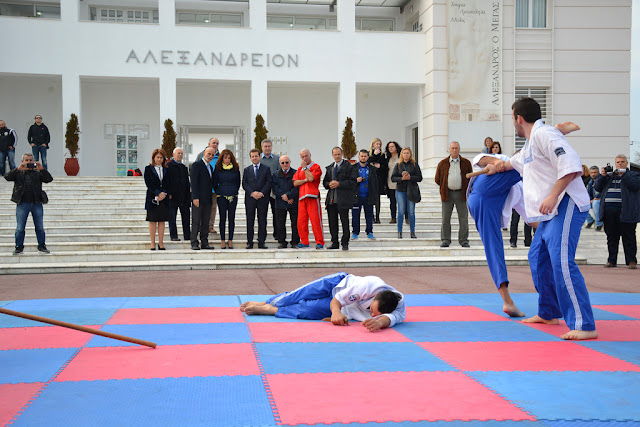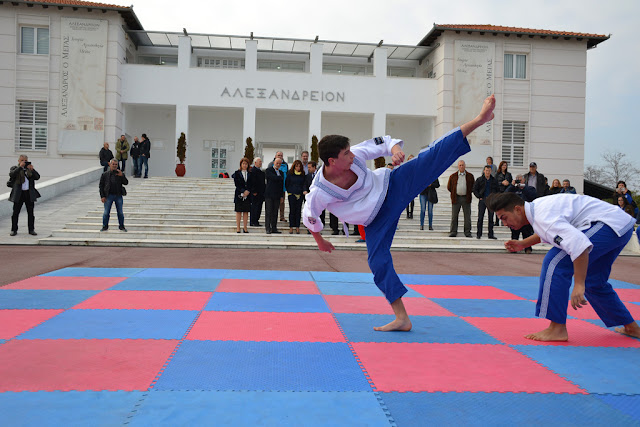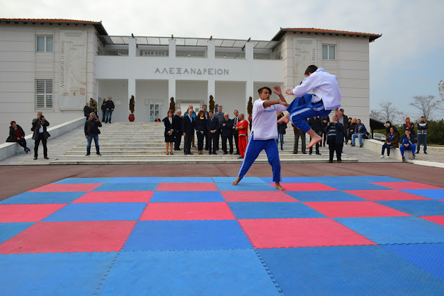 Κατά την προσέλευσή τους στο χώρο του Διεθνούς Ιδρύματος Μεγάλου Αλεξάνδρου οι αθλητές ξεναγήθηκαν στους χώρους του κτιρίου καθώς και στην έκθεση φωτογραφίας με θέμα το Μέγα Αλέξανδρο, που φιλοξενείται στον ισόγειο χώρο, από την αρχαιολόγο κ. Διονυσία Τσίρου.